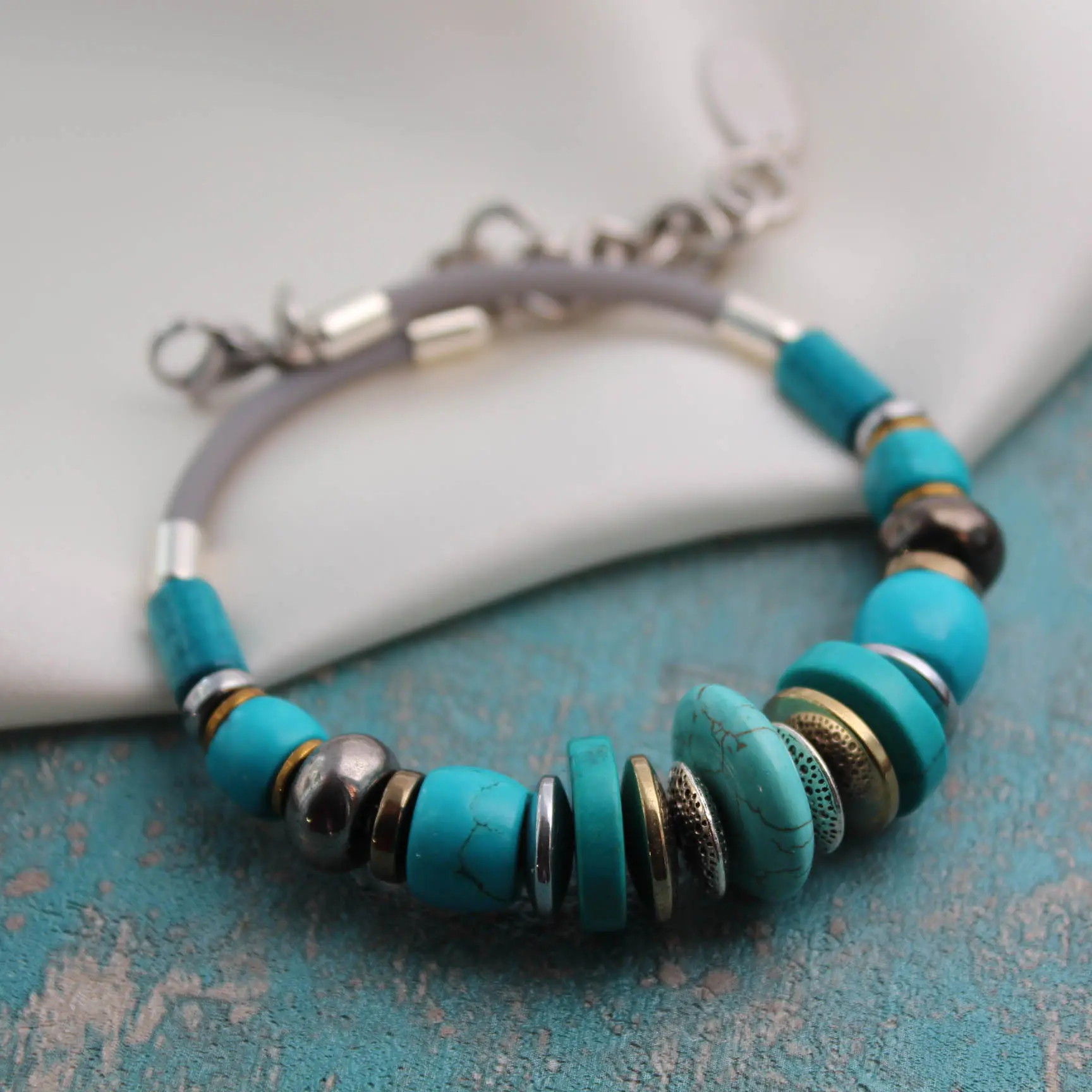 Браслет из бирюзы (турквенита), дерева, гематита, каучука.