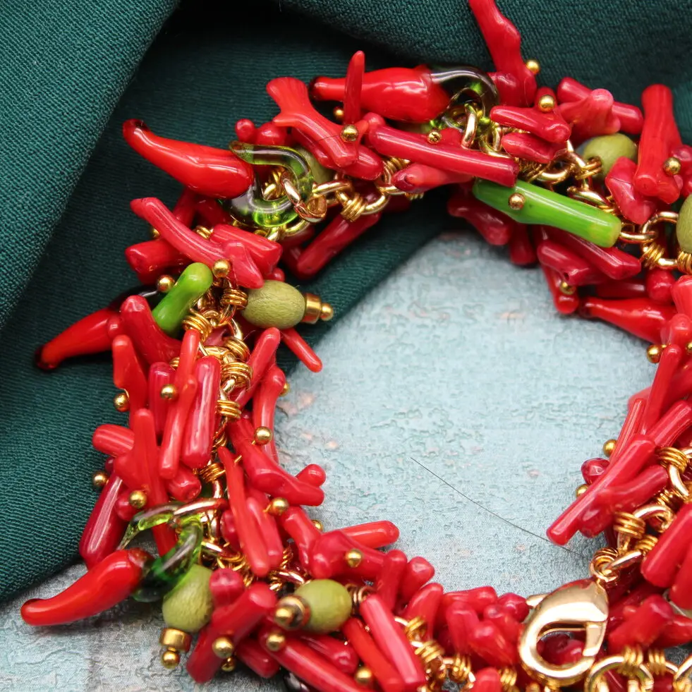 Браслет из натурального красного коралла, богемского стекла в виде перчиков чили, дерева.