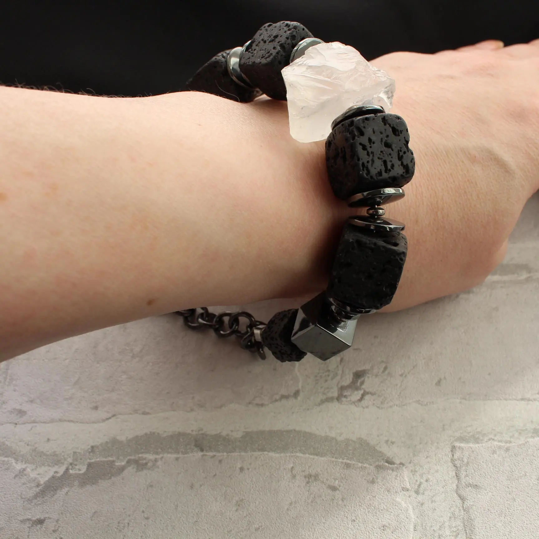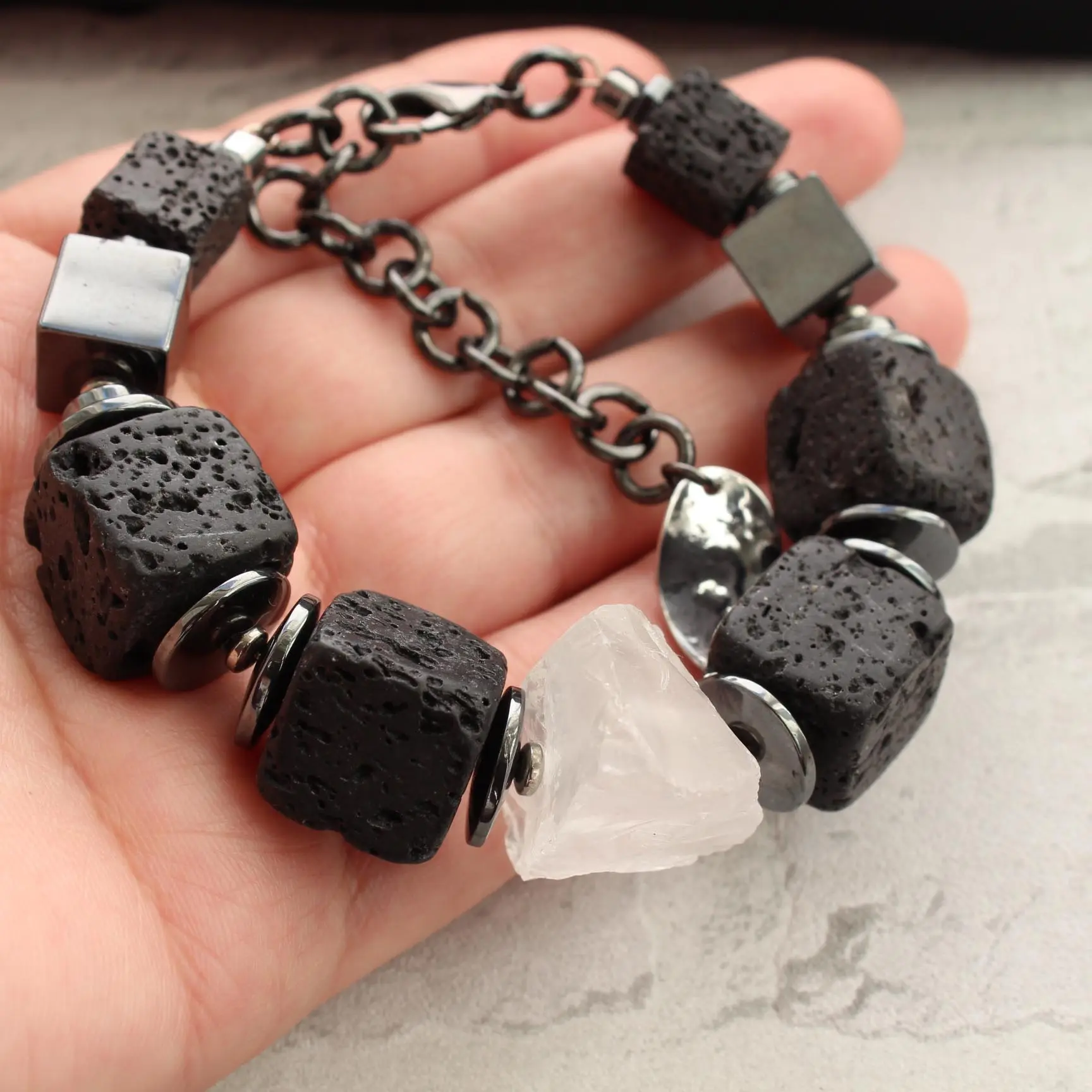 Размер горного хрусталя 15*22*27 мм, лавы 15*15 мм, 10*10 мм, агата 10*10 мм.