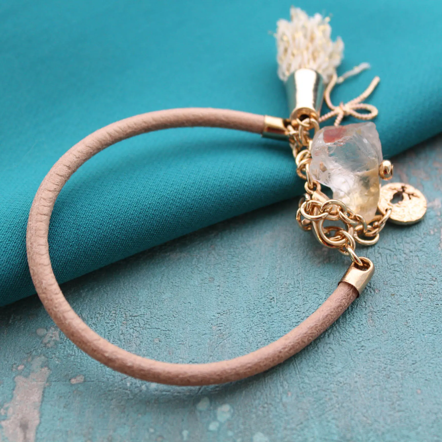 Браслет из скола натурального цитрина, кожи, кисточки из хлопковой нити с золотистым люрексом, позолоченной фурнитуры.