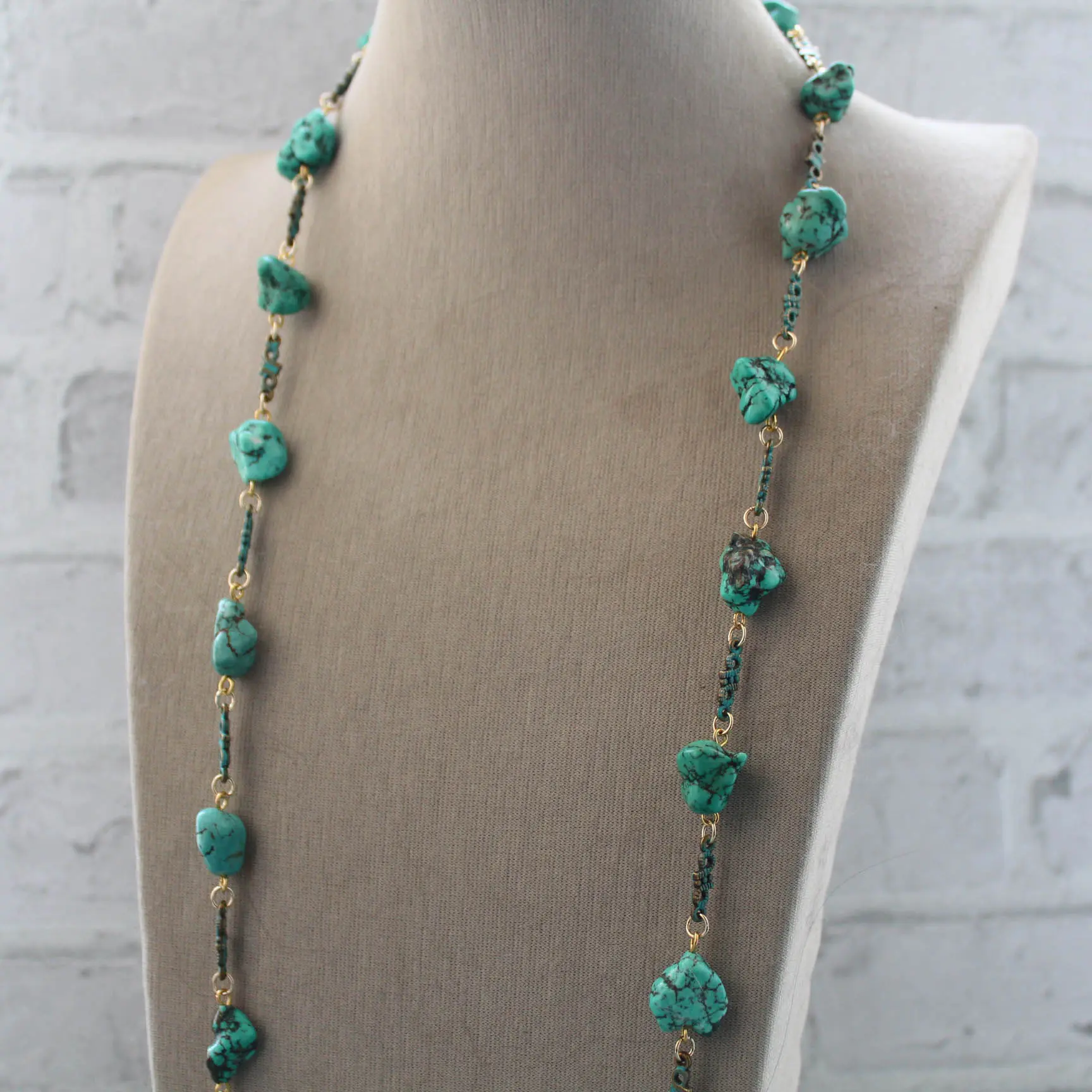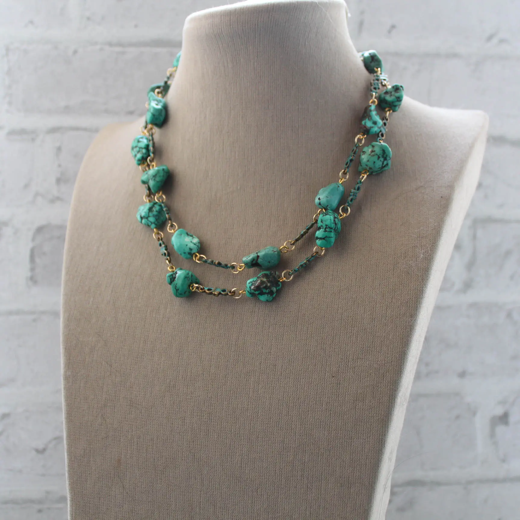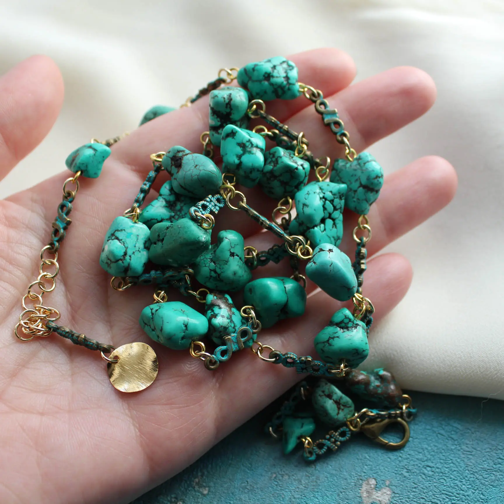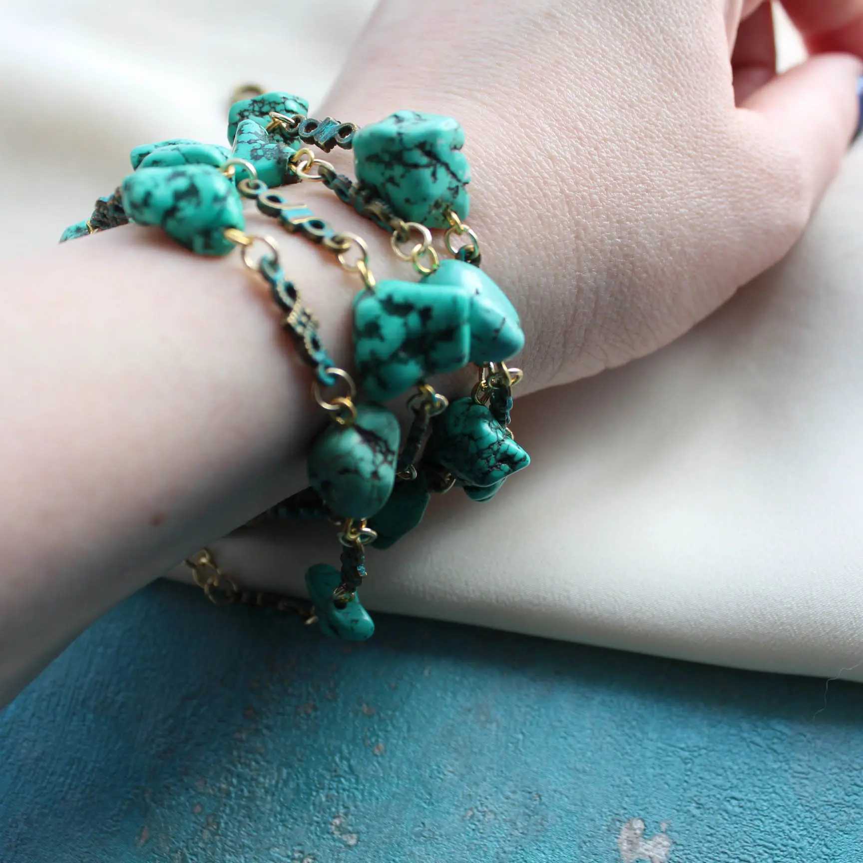Браслет-намотка из самородков бирюзы (магнезита), позолоченной, бронзовой с патиной фурнитуры.