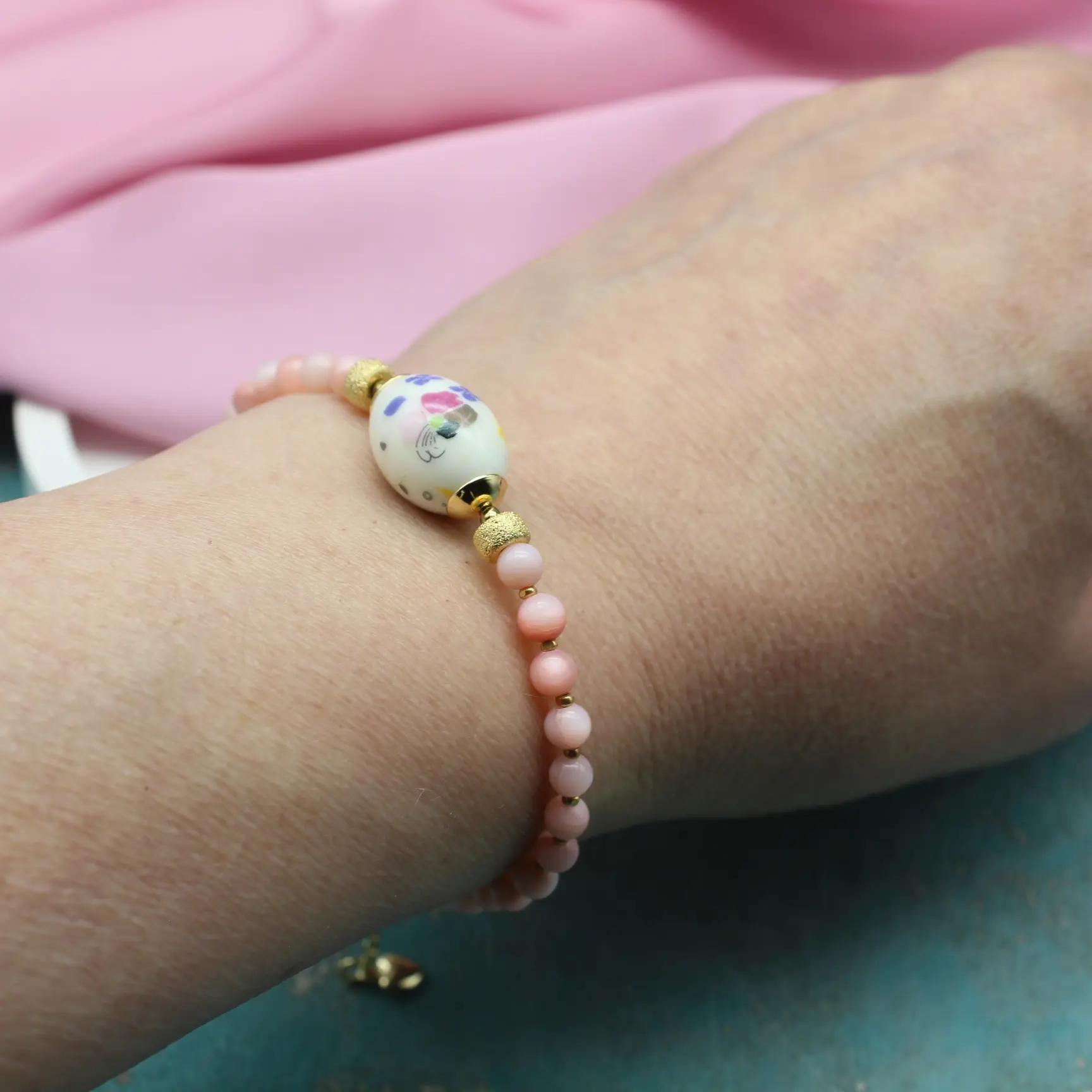Колье-чокер из натурального розового перламутра, расписного фарфора, попозолоченной фурнитуры.