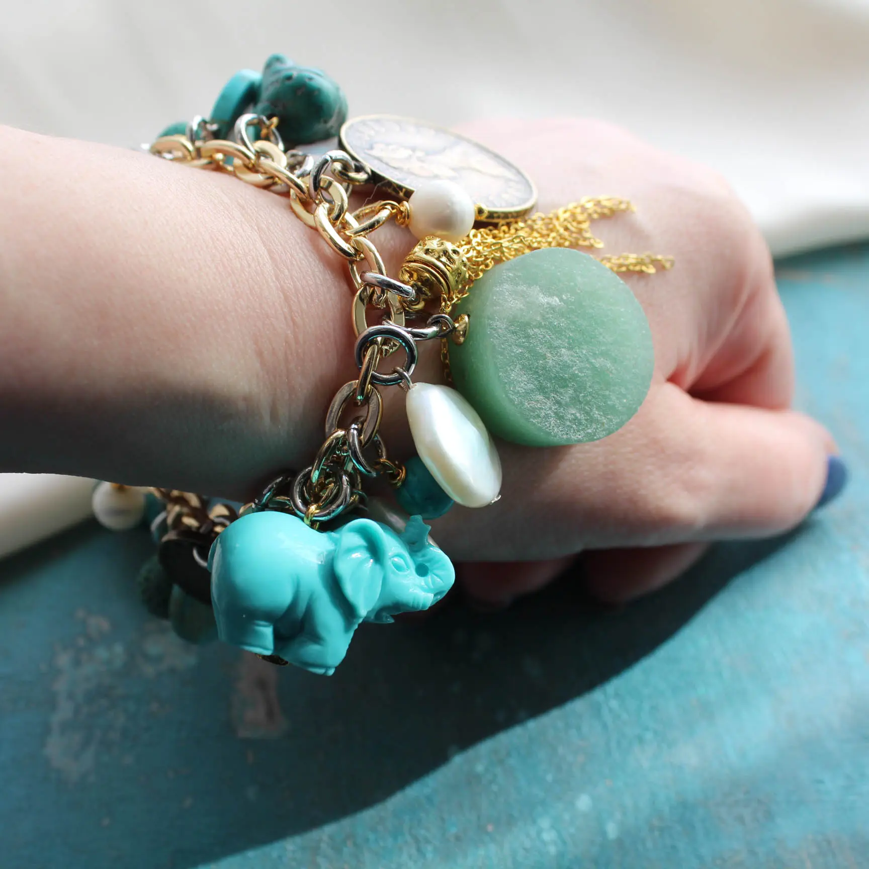 Браслет из натуральных жемчужин барокко, жемчуга, зеленой бирюзы (имитация из прирдного магнезита), прессованной бирюзы, нефрита, резного пластика в виде симпатичного слоника, винтажных монет.