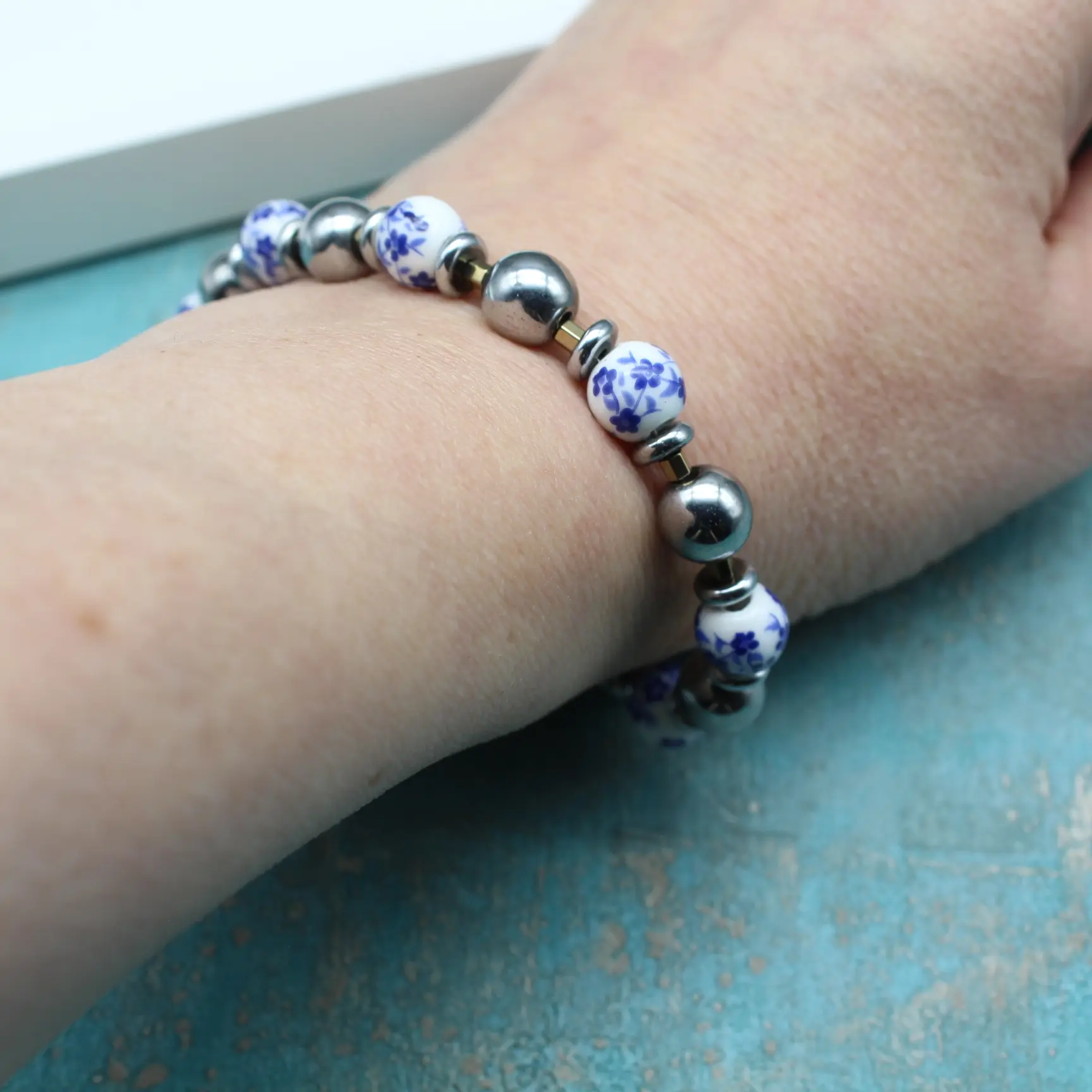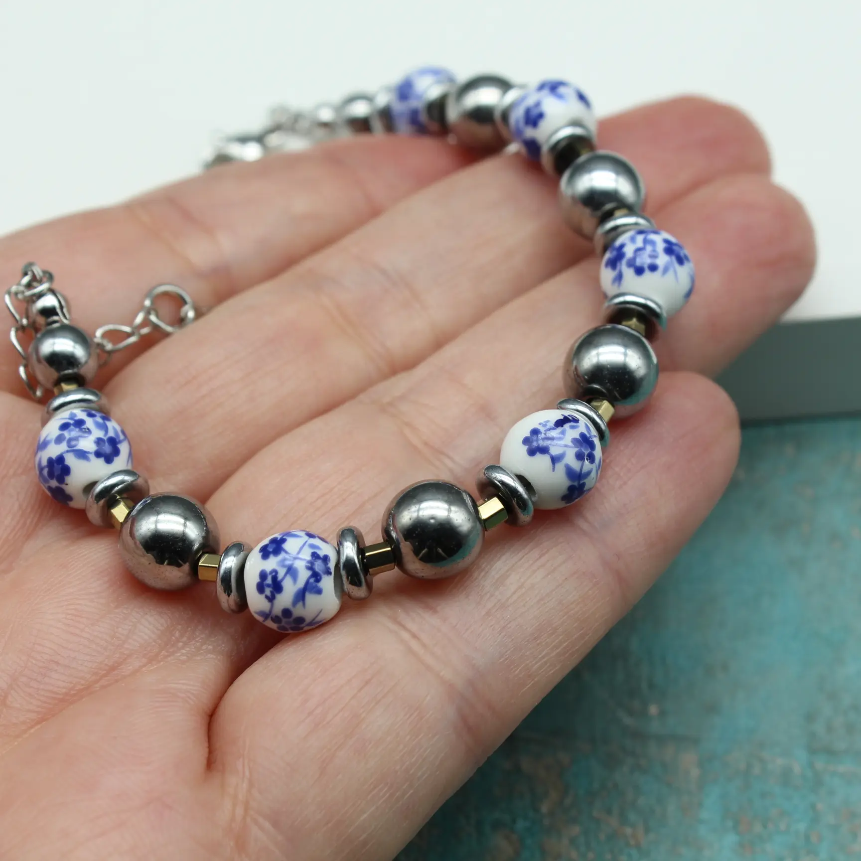 Браслет из расписного фарфора, гематита, посеребренной фурнитуры.