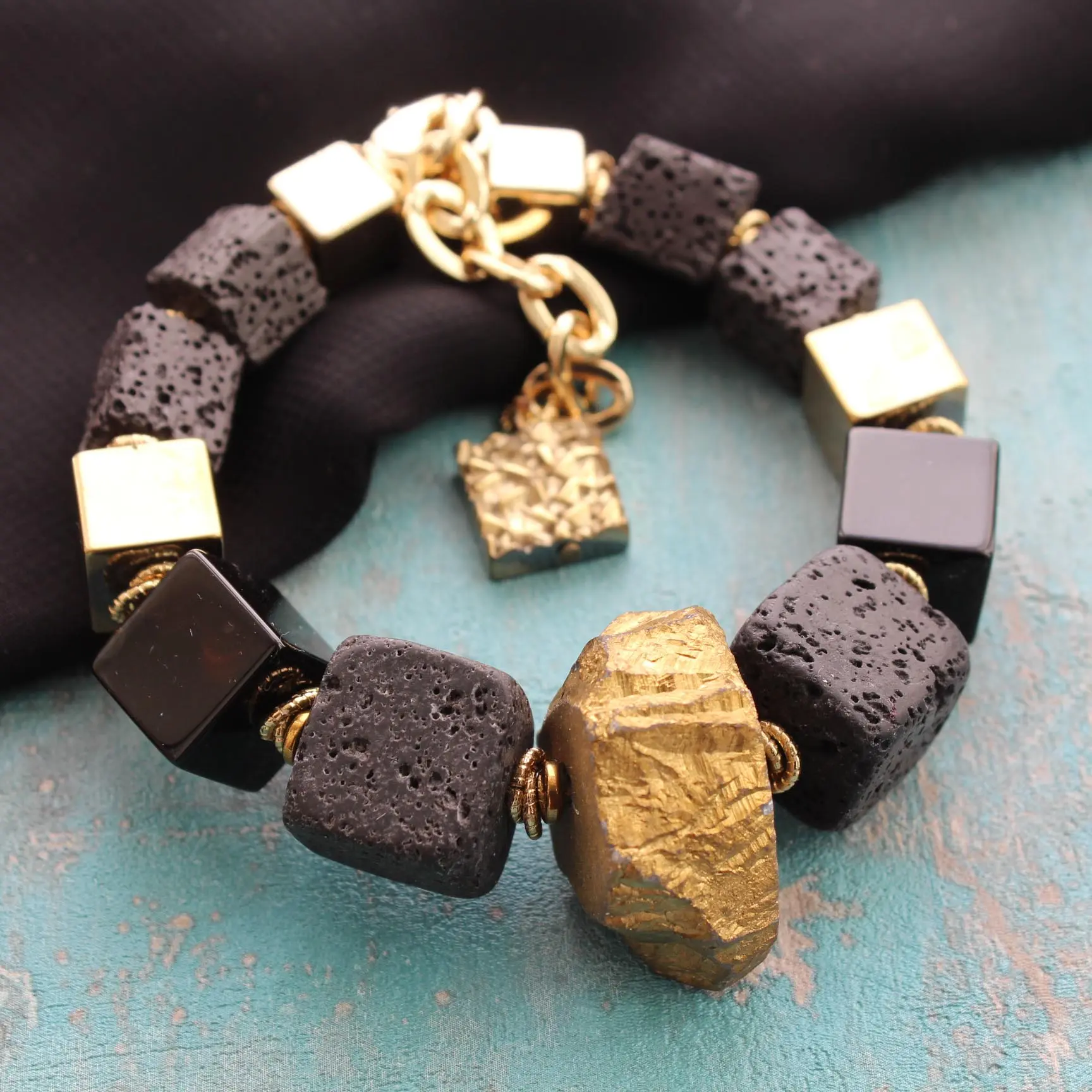 Браслет из натурального кварца с золотым напылением, океанической лавы, черного агата, гематита.