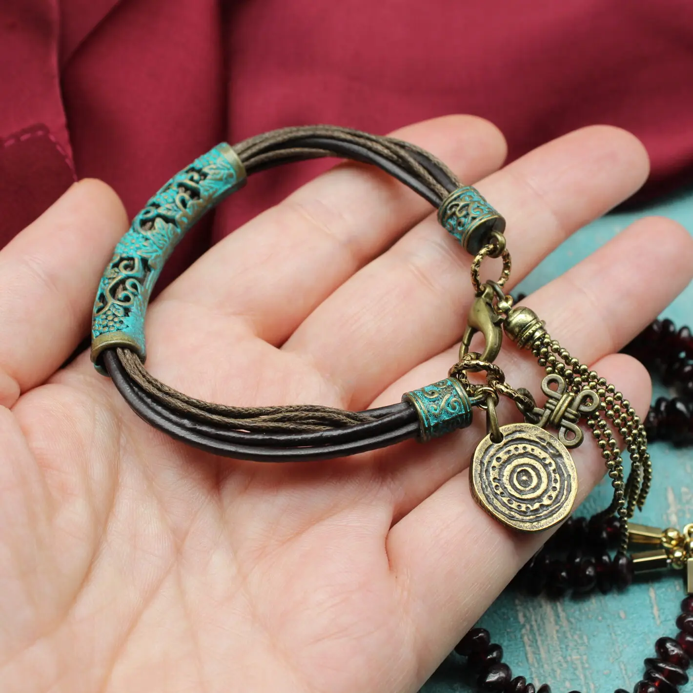 Сет из двух браслет из натурального граната, кожи, латуни с бирюзовой патиной, бронзы.