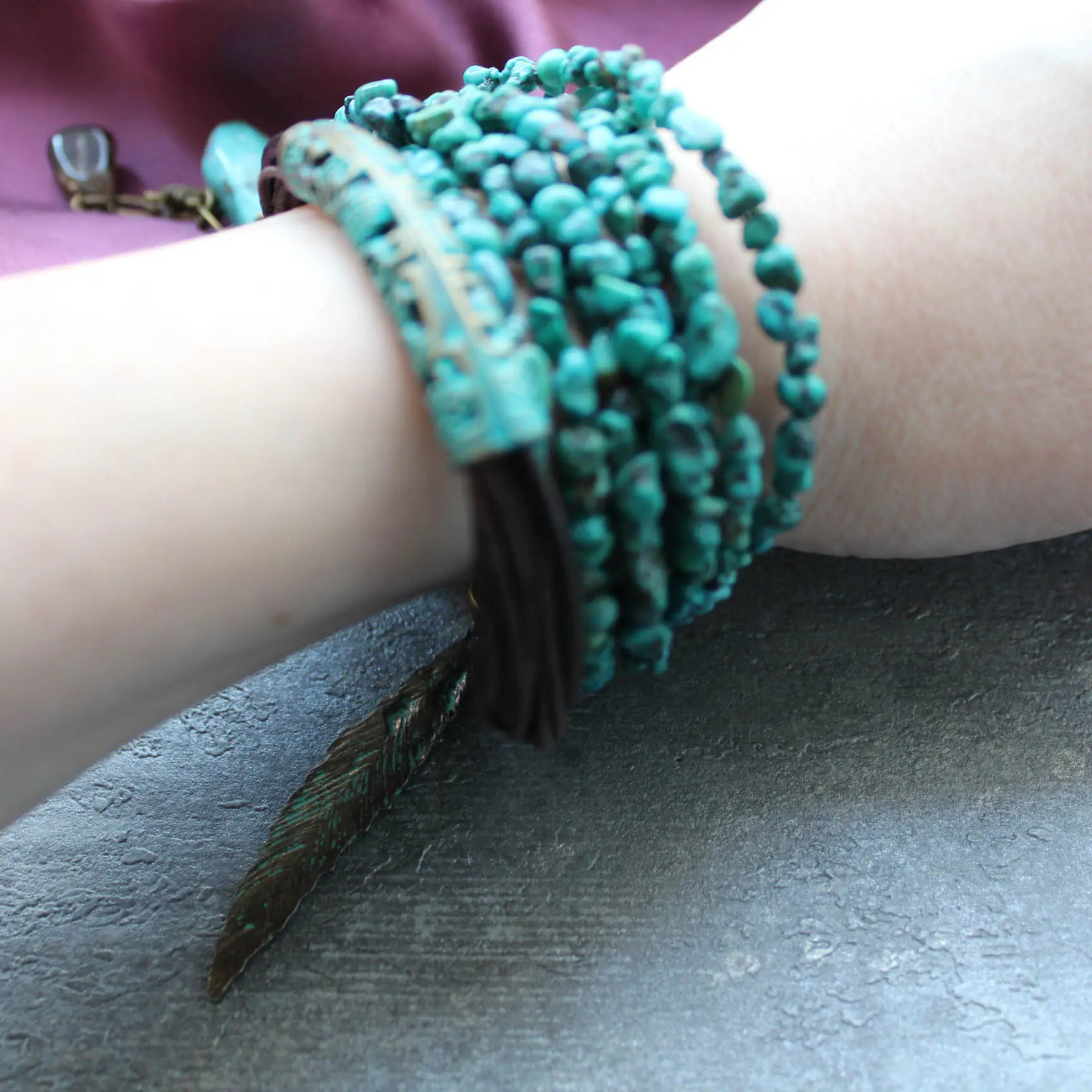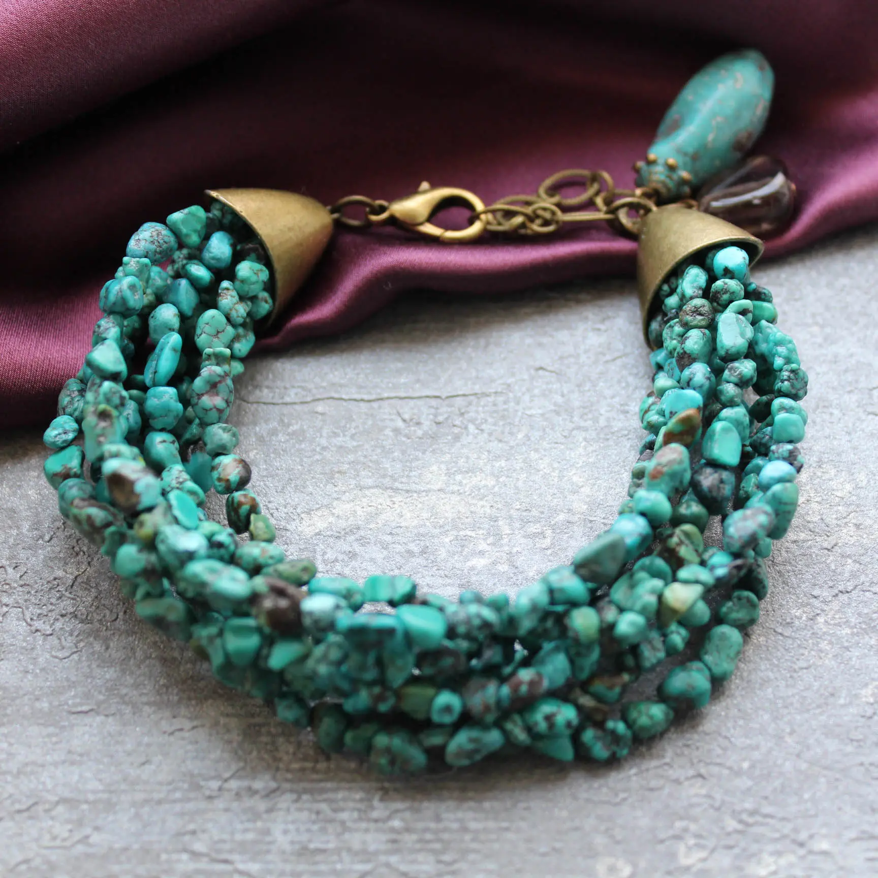 Браслет из натуральных самородков бирюзы (Аризона, США), кожи, хлопка, бронзы.