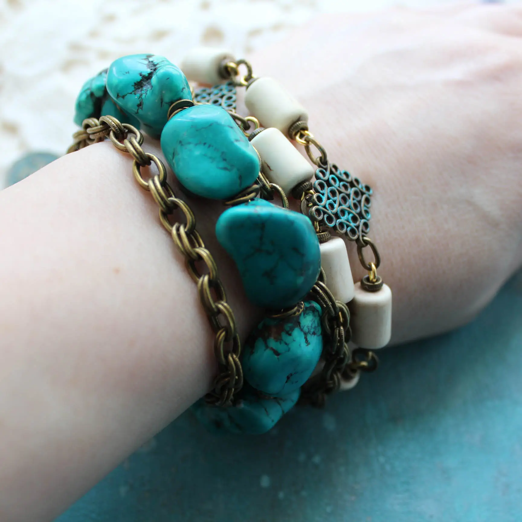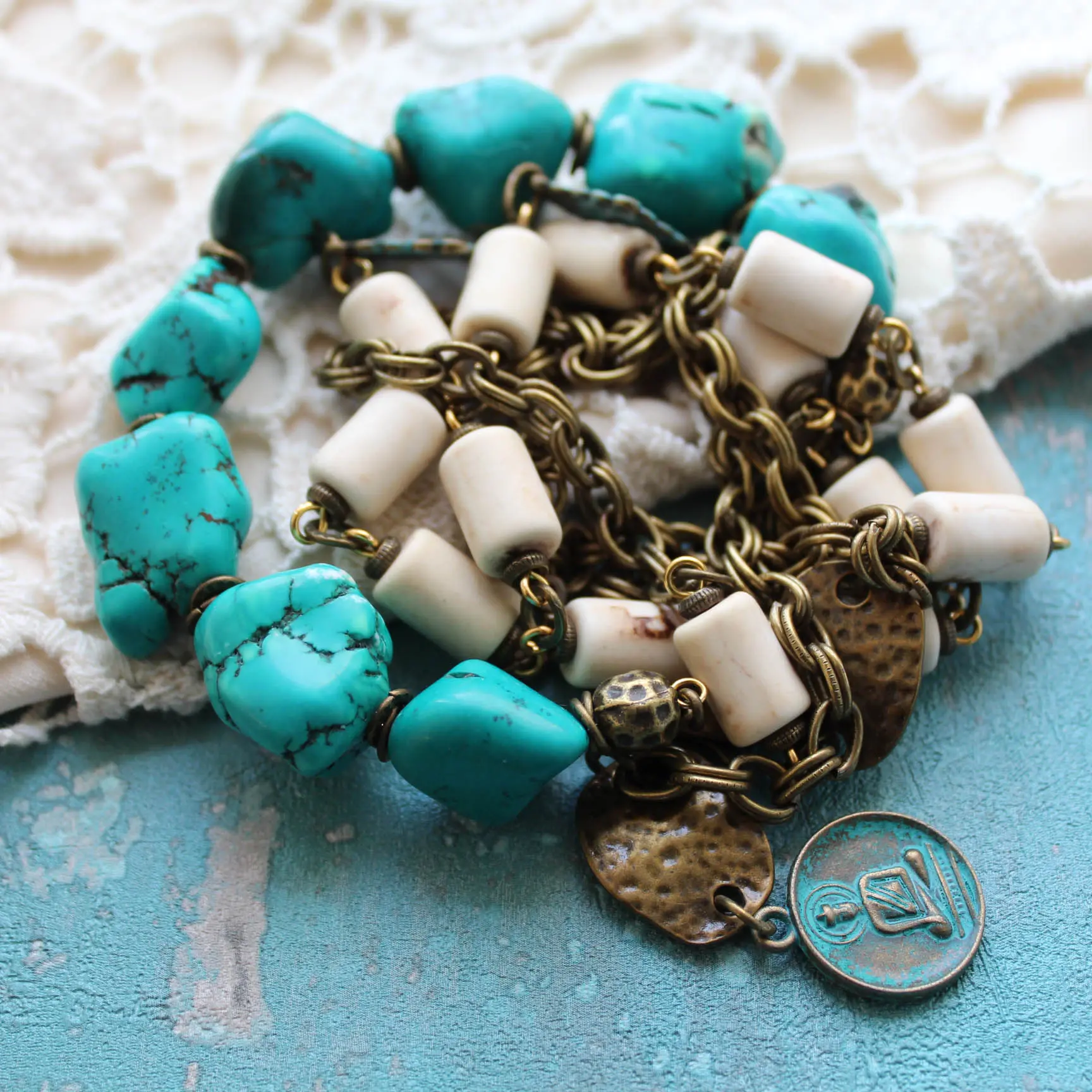 Браслет-намотка из бирюзы (имитация из самородков магнезита), кости яка, бронзы, латуни.