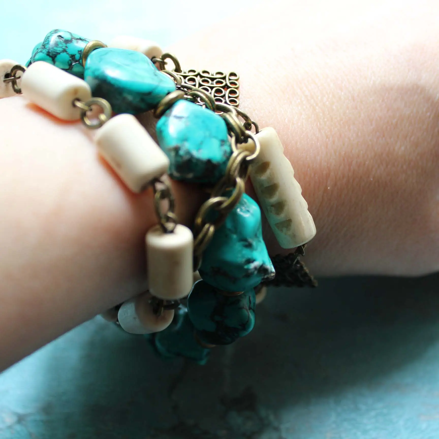 Браслет из зеленой бирюзы (самородки говлита), обработанного говлита, бронзовой и латунной фурнитуры.