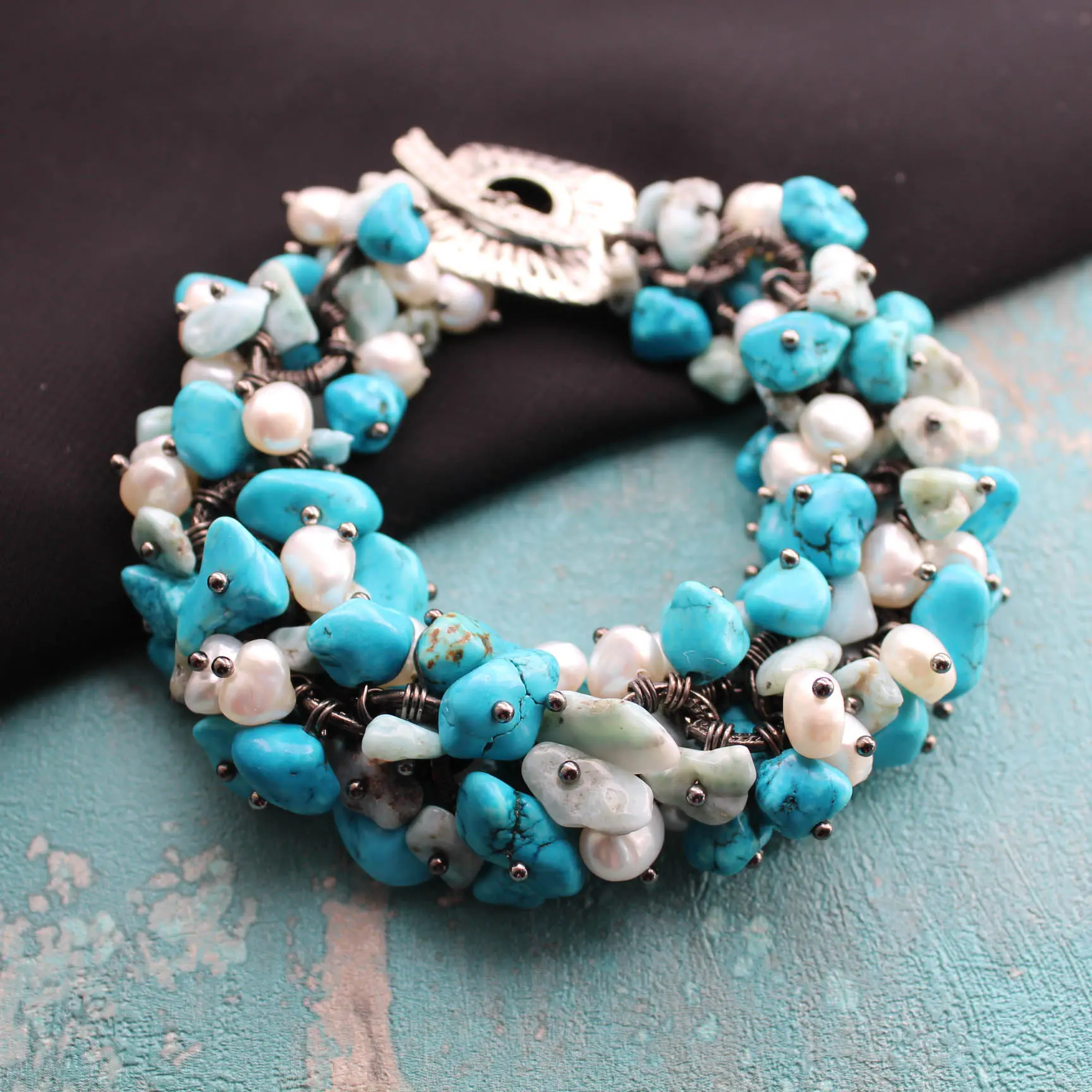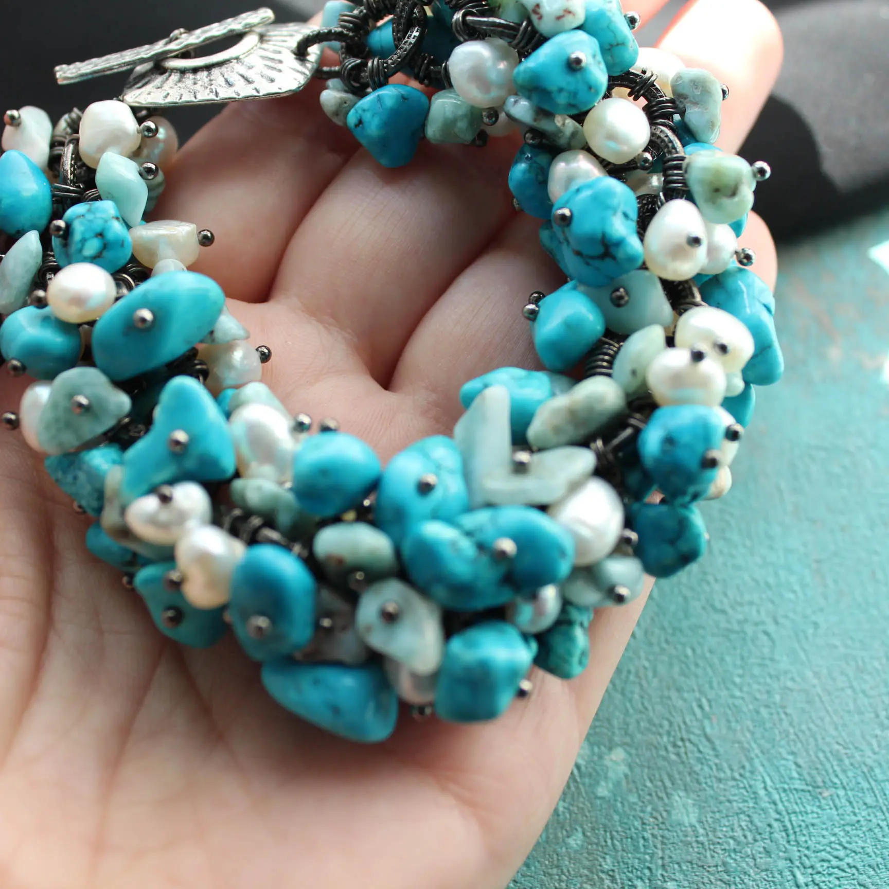 Браслет из самородков бирюзы (говлита), ларимара, жемчуга формы "барокко".
