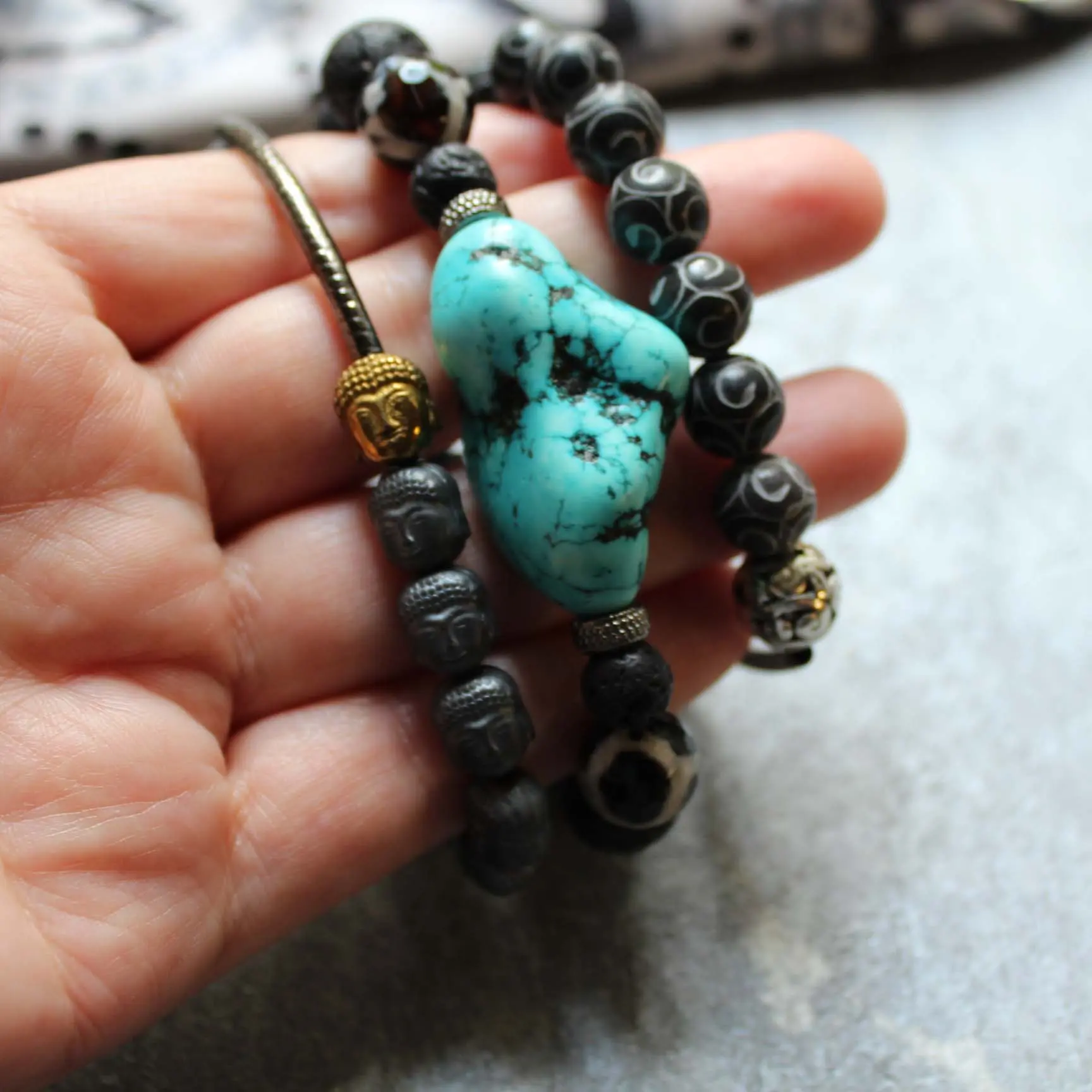 Браслеты из самородка бирюзы (турквенита), резного агата, расписного стекла, резного гематита в виде головы Будды, агата дзи, лавы.