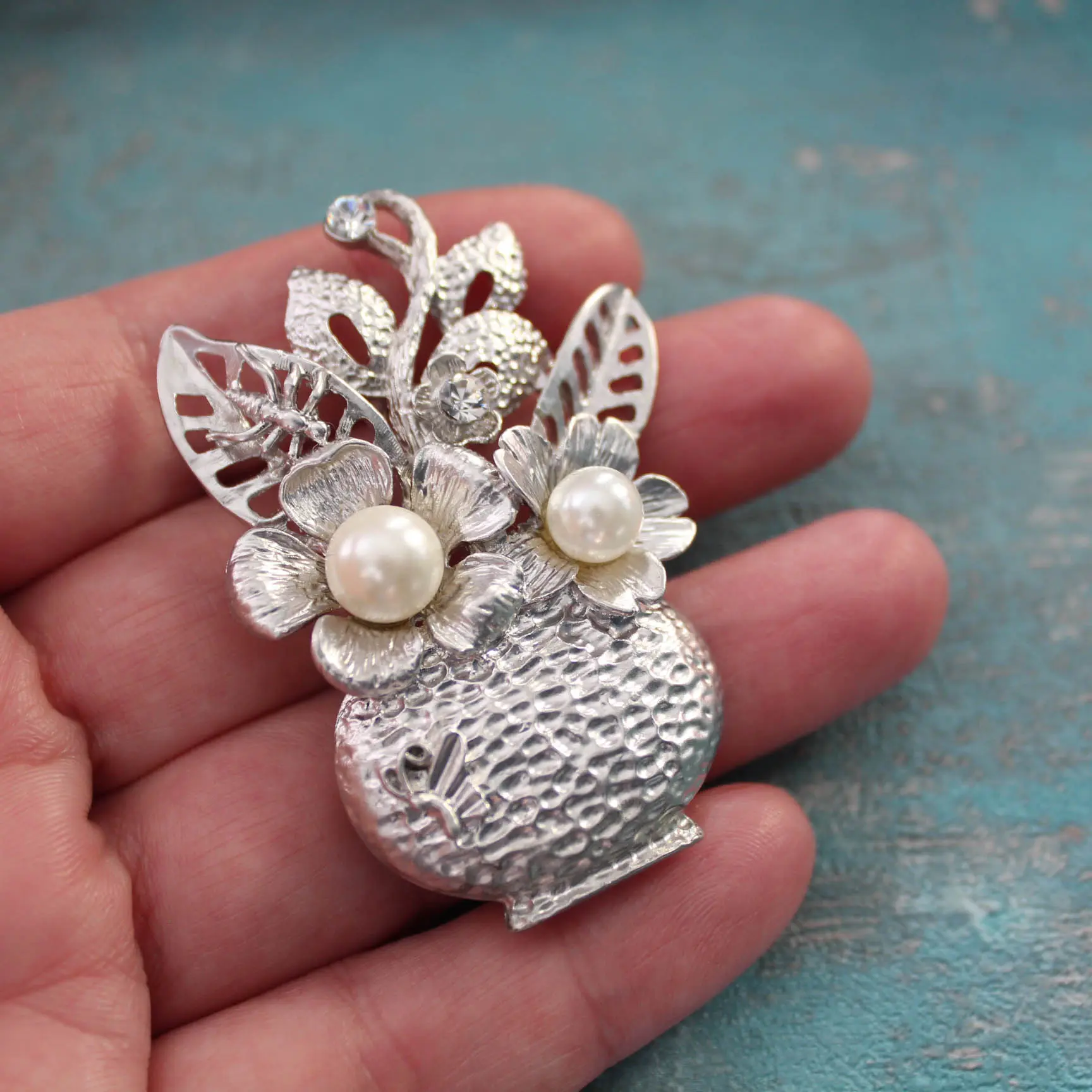 Брошь в виде букета в цветочной вазе из страз, жемчуга (искусственного), металлического сплава.