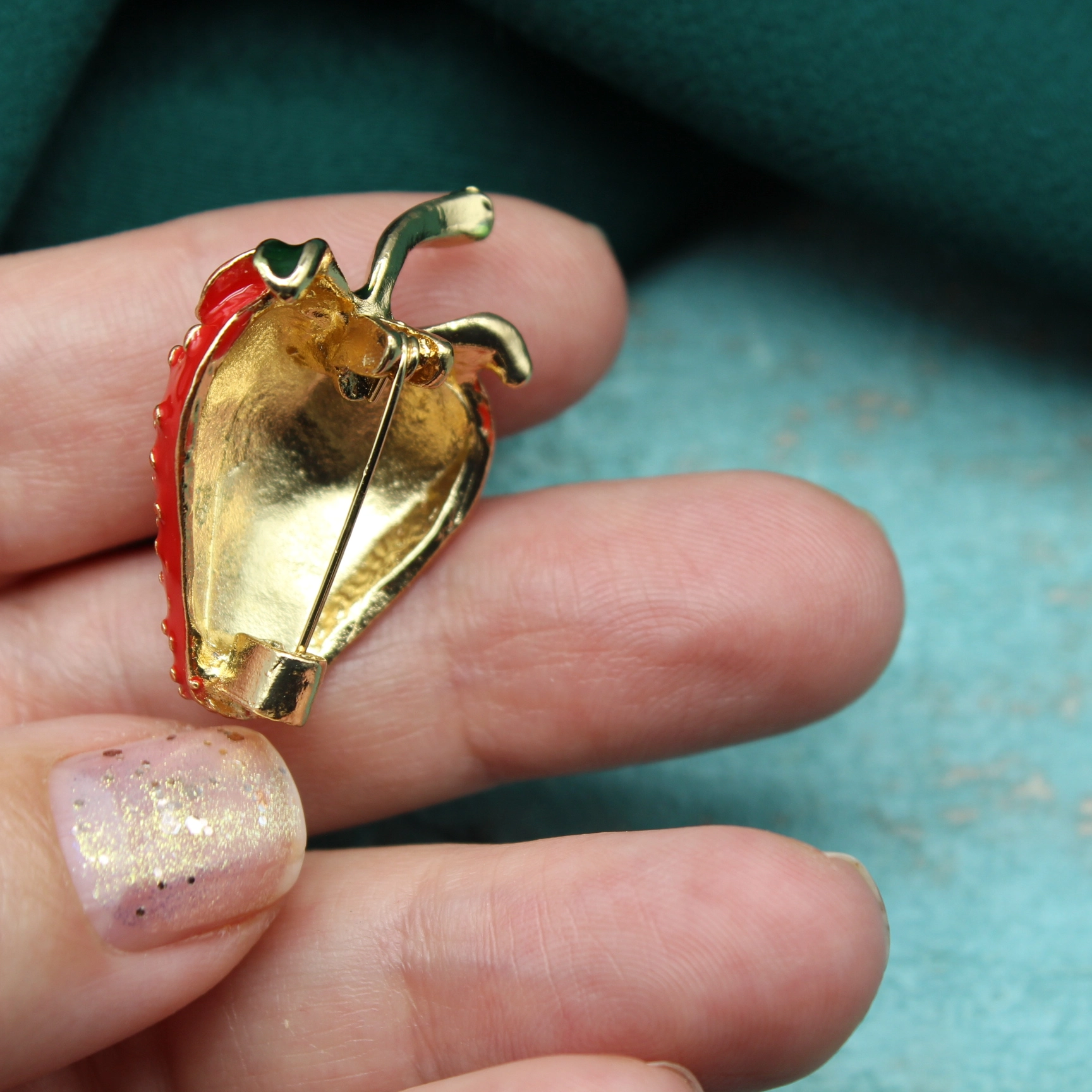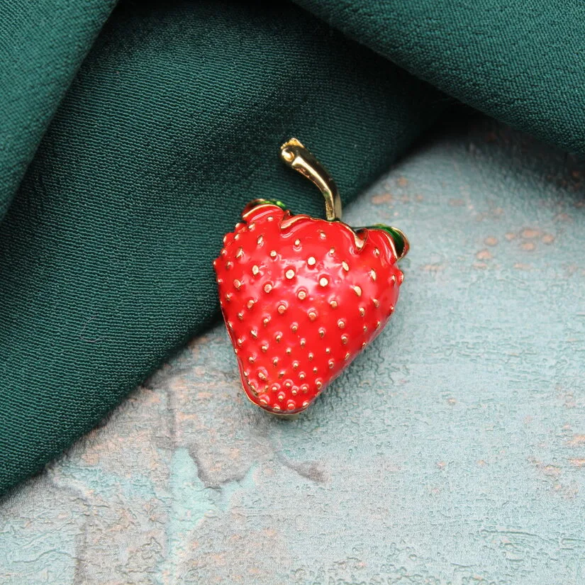 Брошь в виде спелой клубнички из золотистого металлического сплава, красной и зеленой эмали.