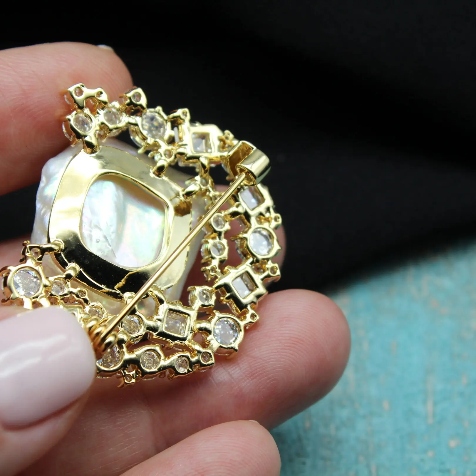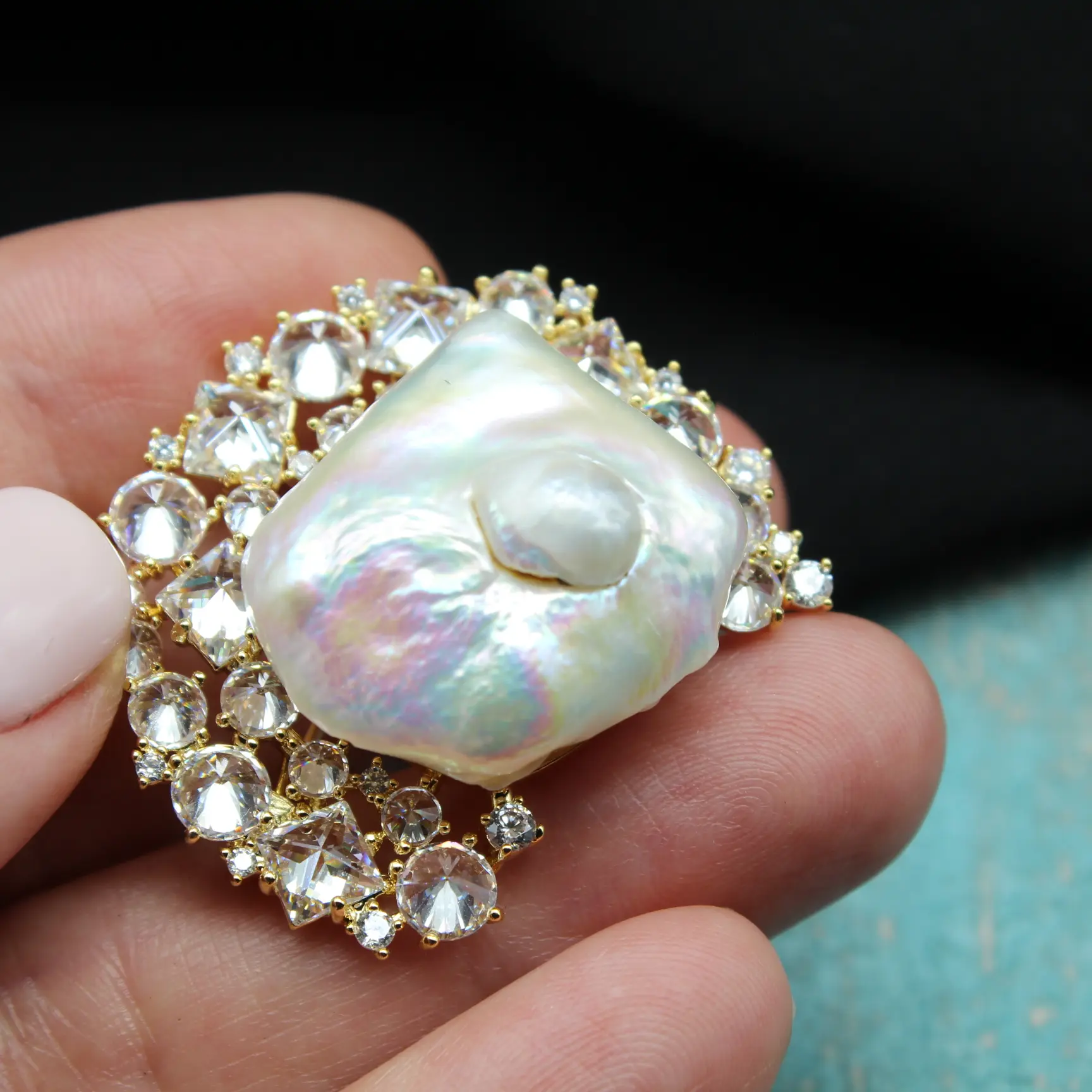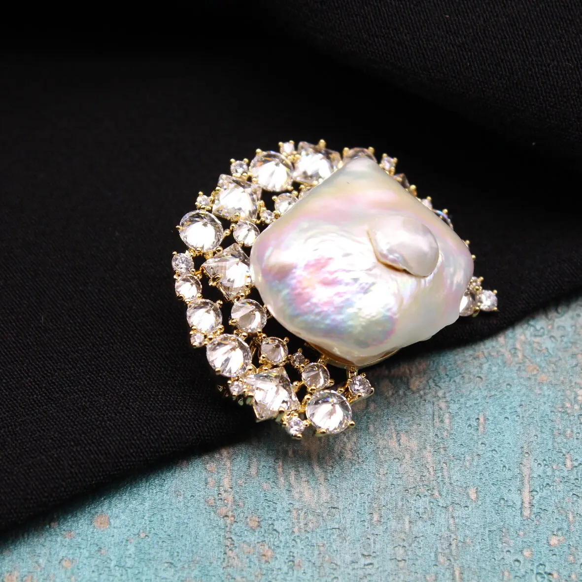 Брошь из крупного натурального барочного жемчуга, позолоченного сплава 24К, прозрачных цирконов.