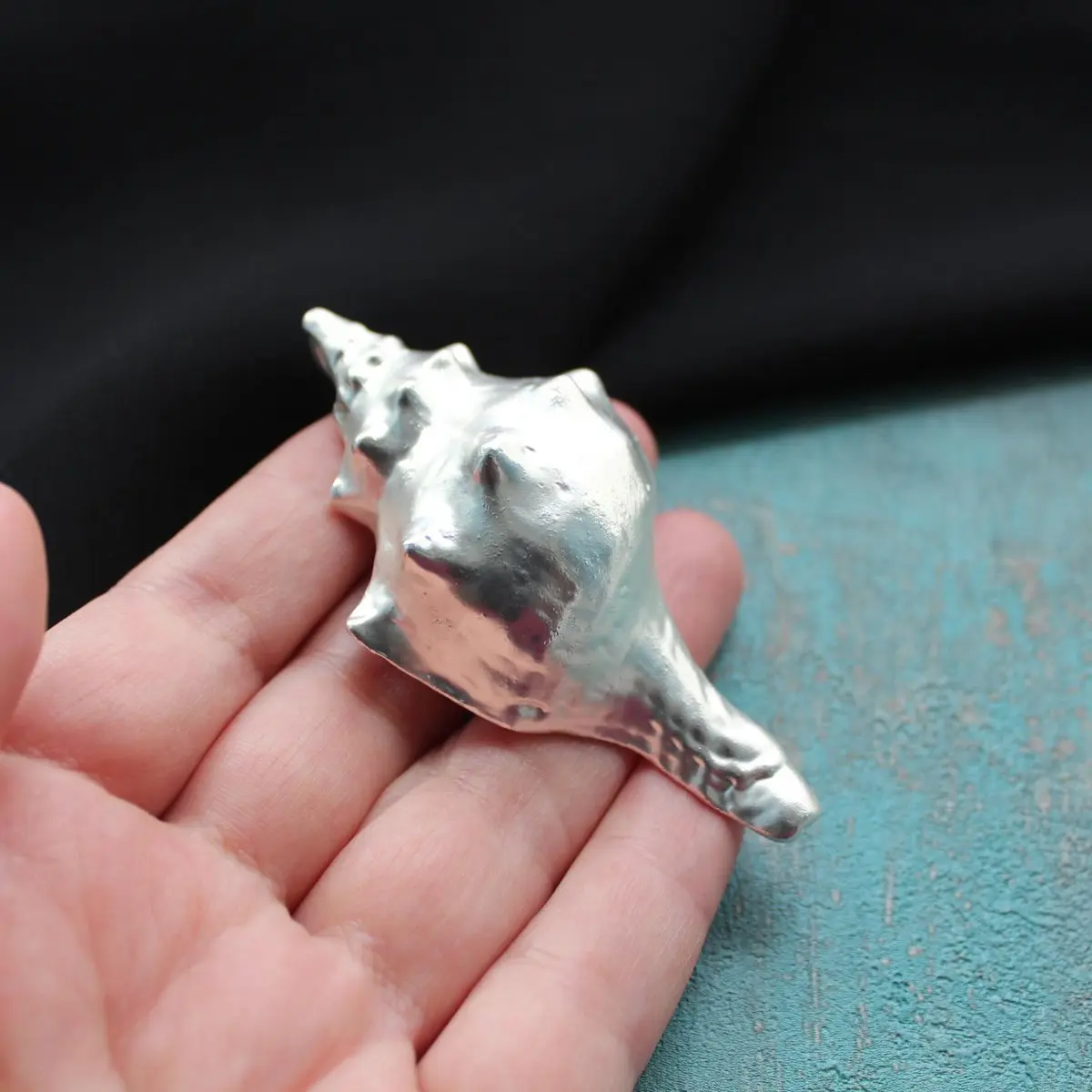 Крупная брошь из серебристого сплава в виде объемной морской ракушки.