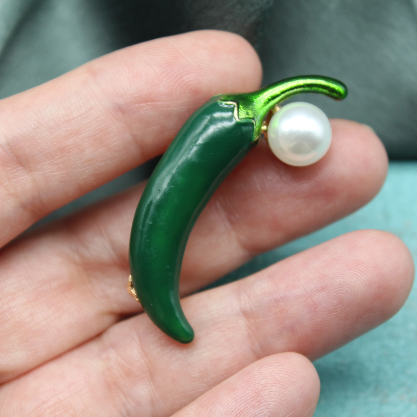 Брошь в виде зеленого перчика чили из золотистого металлического сплава, жемчуга майорки и зеленой эмали.