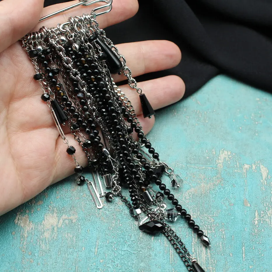 Брошь булавка из серебристого сплава, черного агата, Богемского стекла, черной шпинели, цепей.