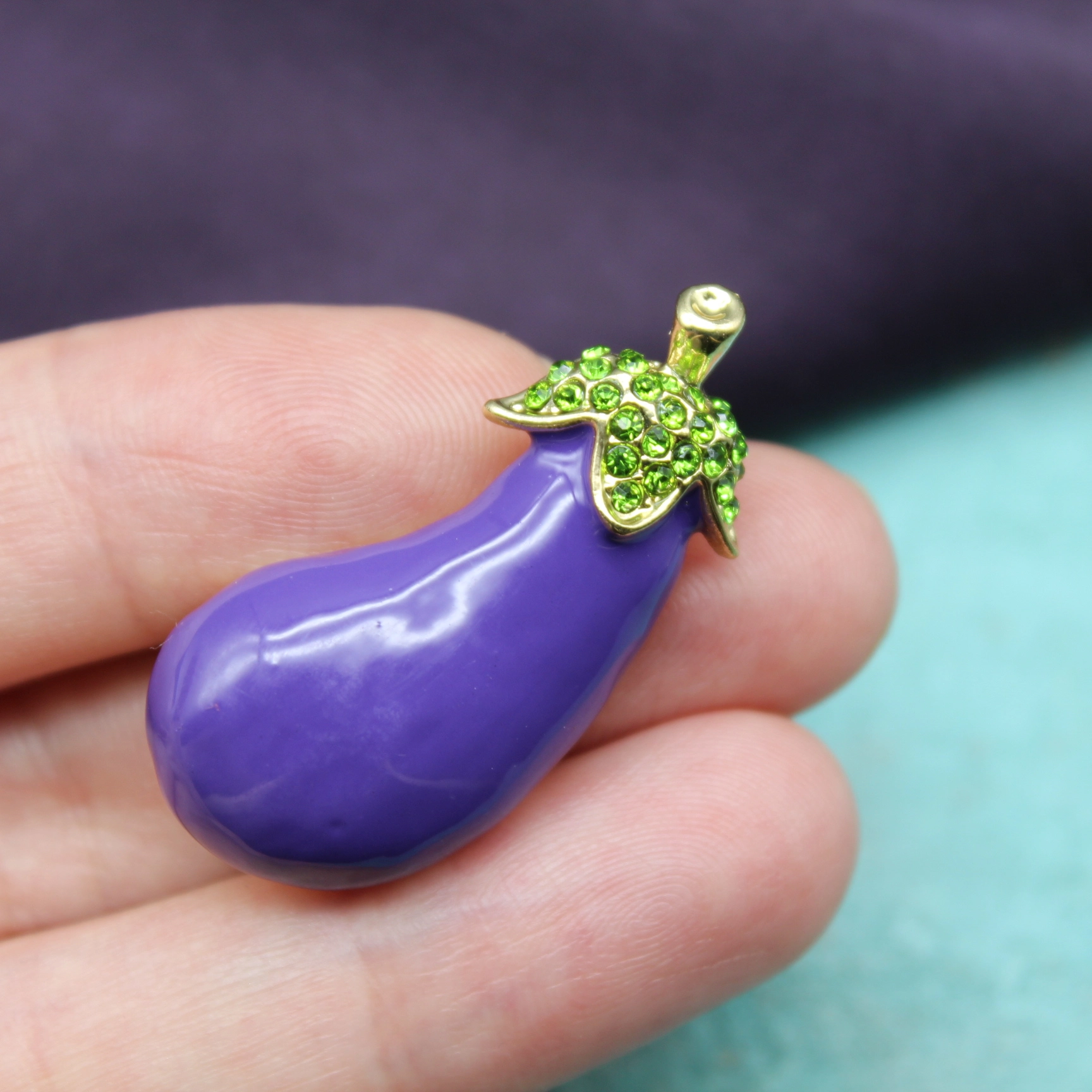 Брошь в виде симпатичного баклажанчика из золотистого металлического сплава, зеленой эмали, зеленых страз.