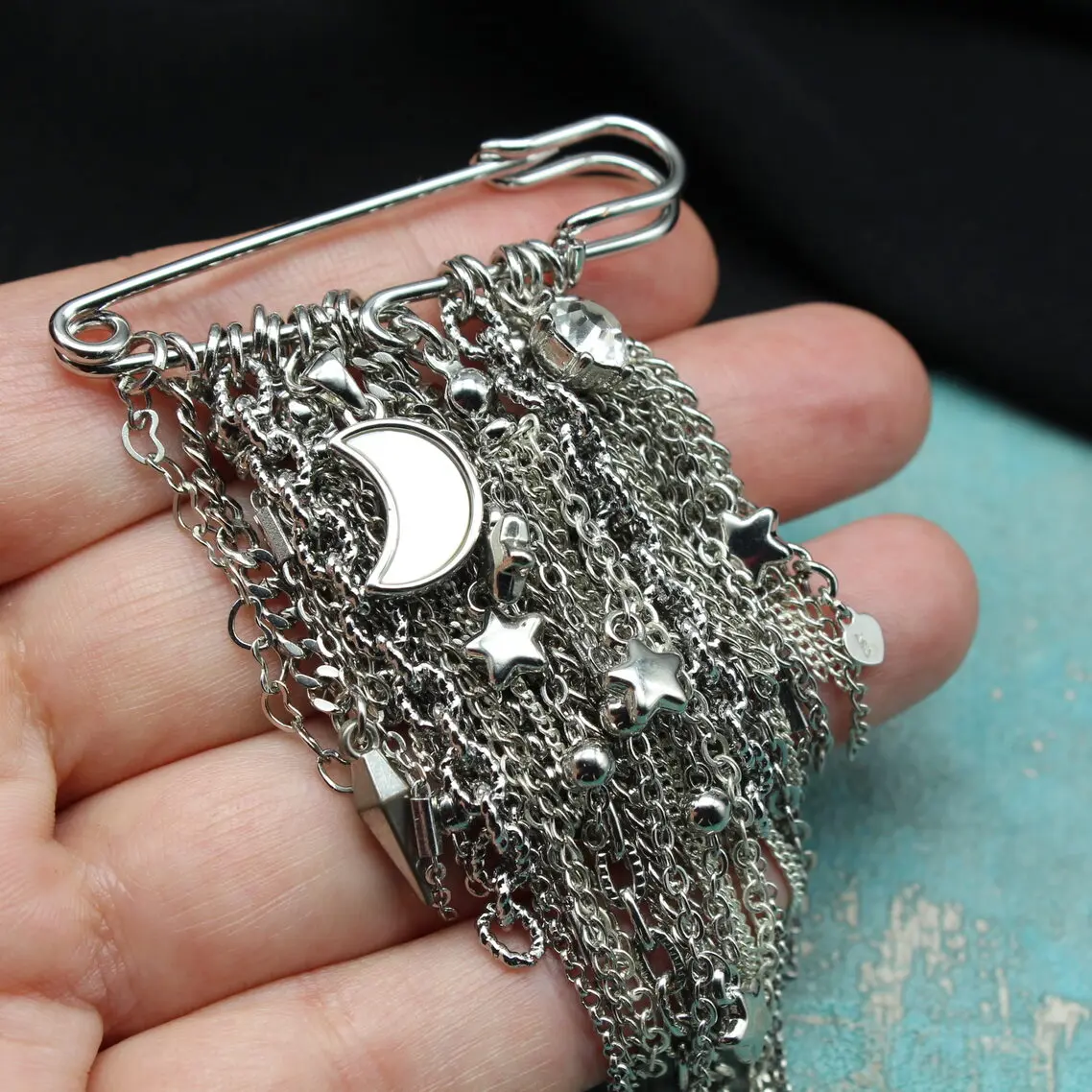 Брошь булавка из серебристого сплава, разнообразных цепей и подвесок.