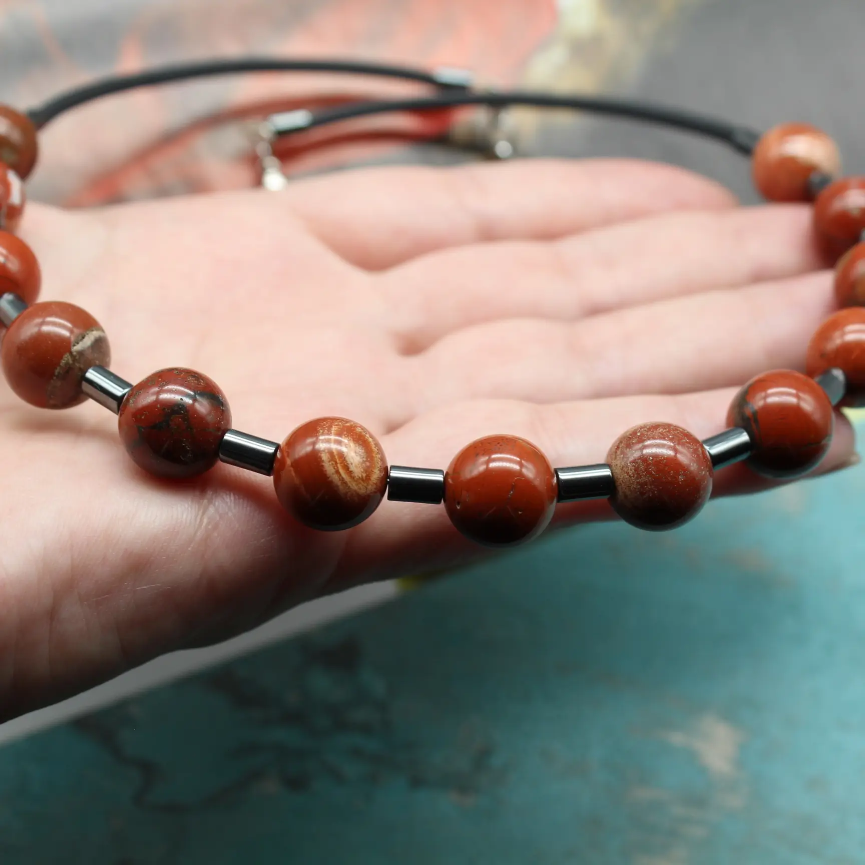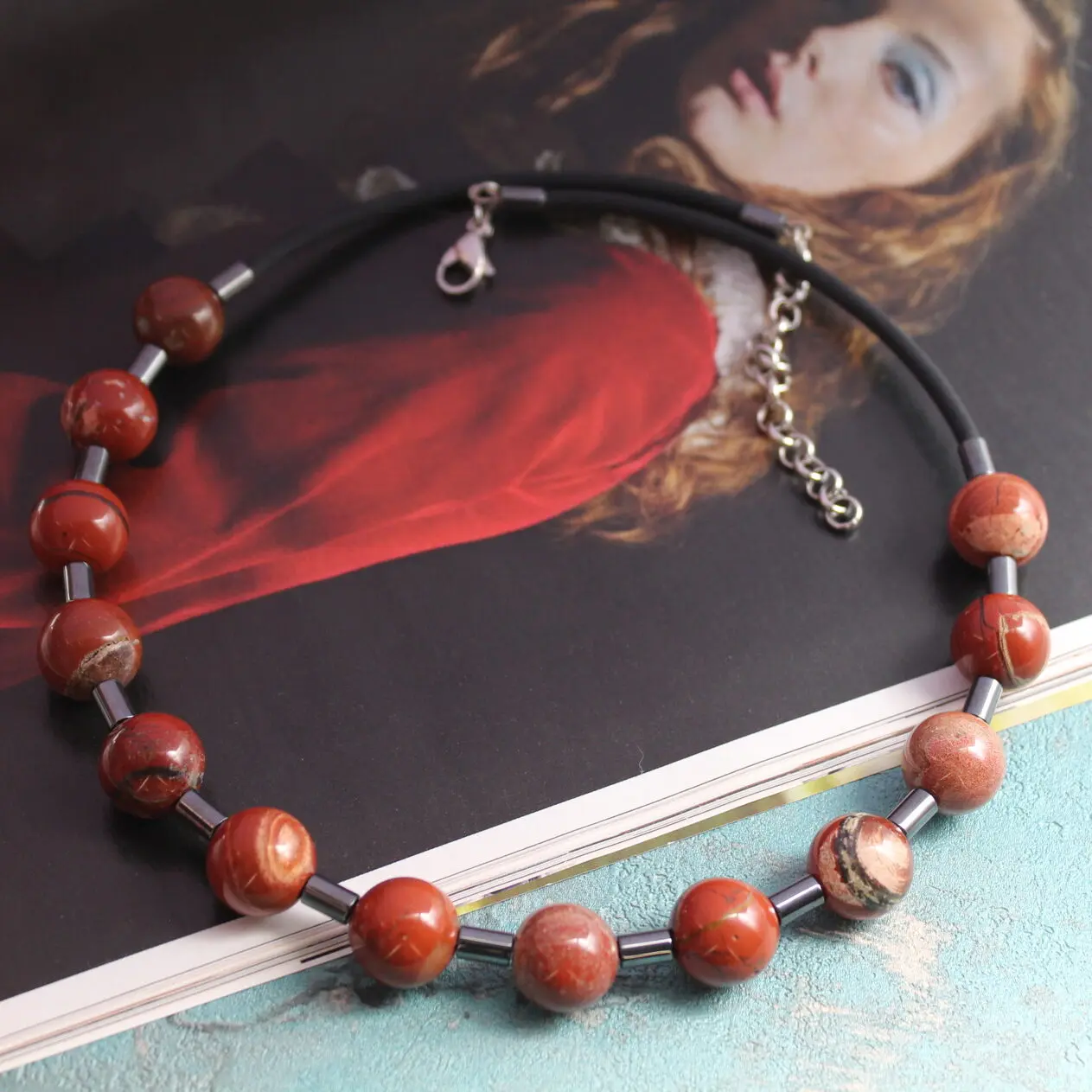 Ожерелье из красной яшмы, каучука, посеребренной черненной фурнитуры.