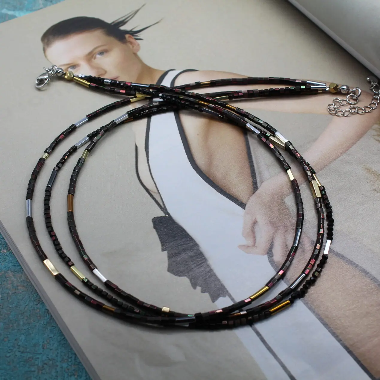 Ожерелье из гематита, разноцветных цирконов, родированного стального сплава.