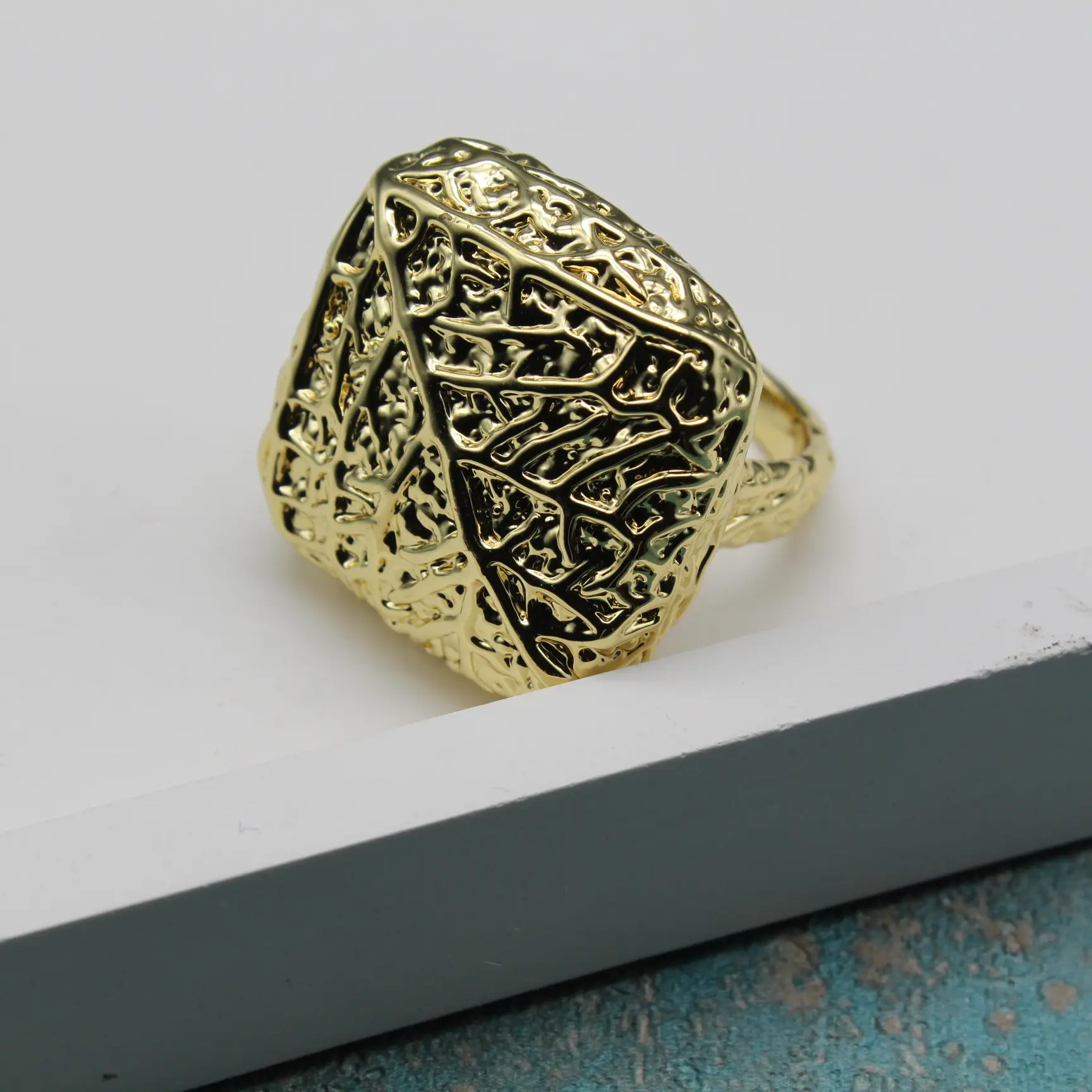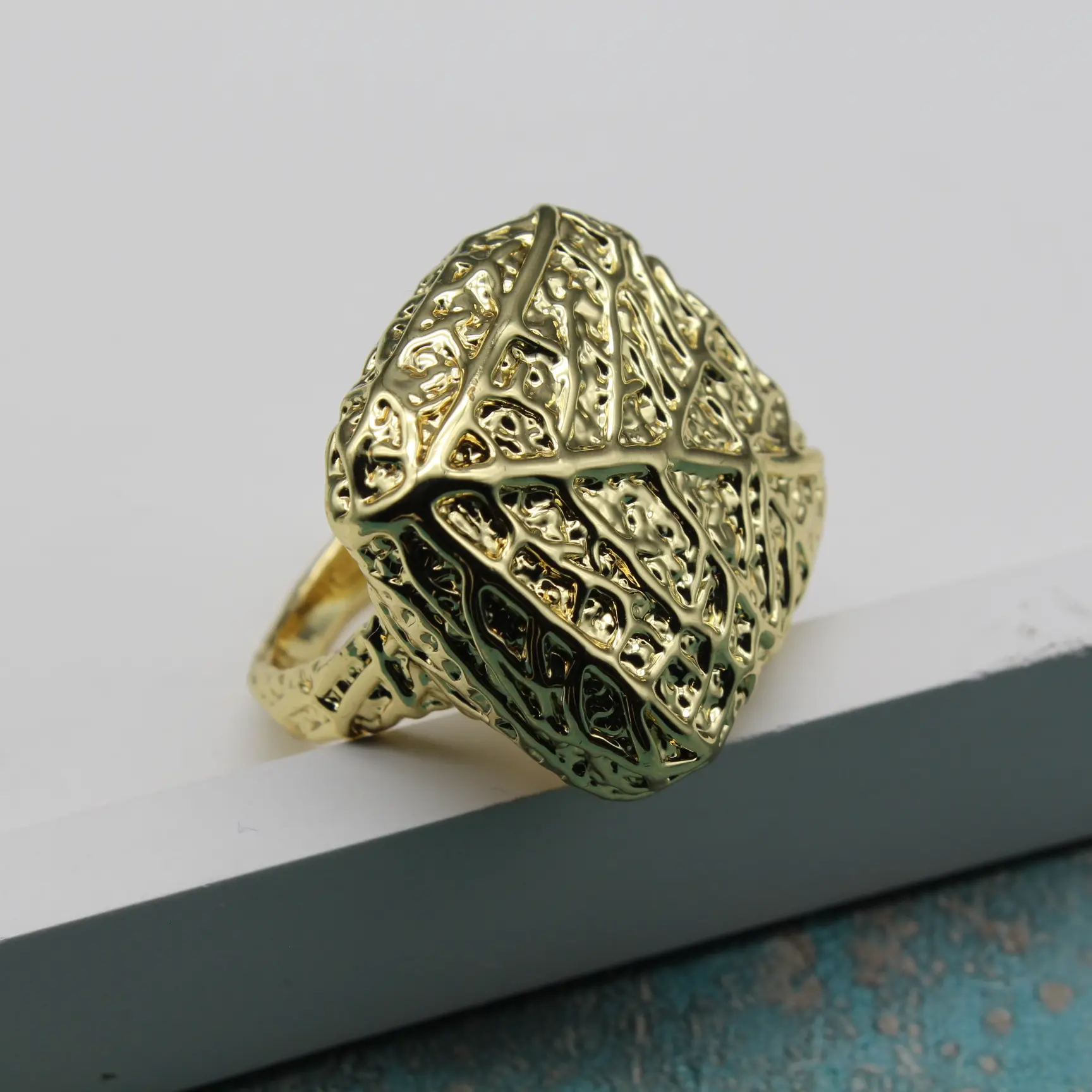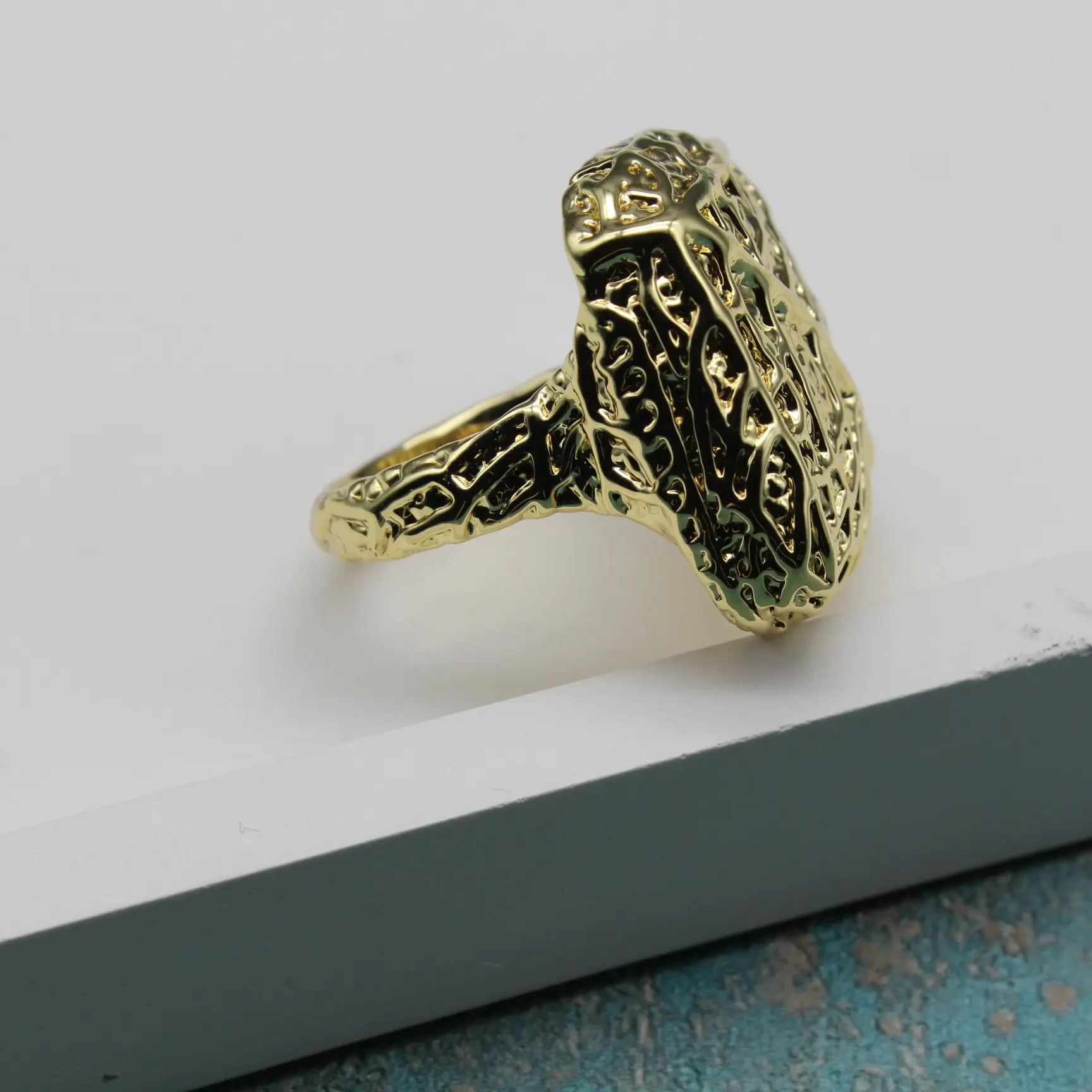Перстень из позолоченного металлического сплава с изысканным фактурным рисунком в виде листьев.