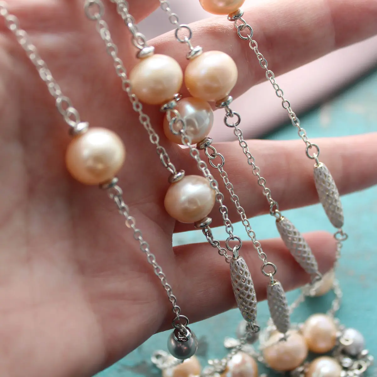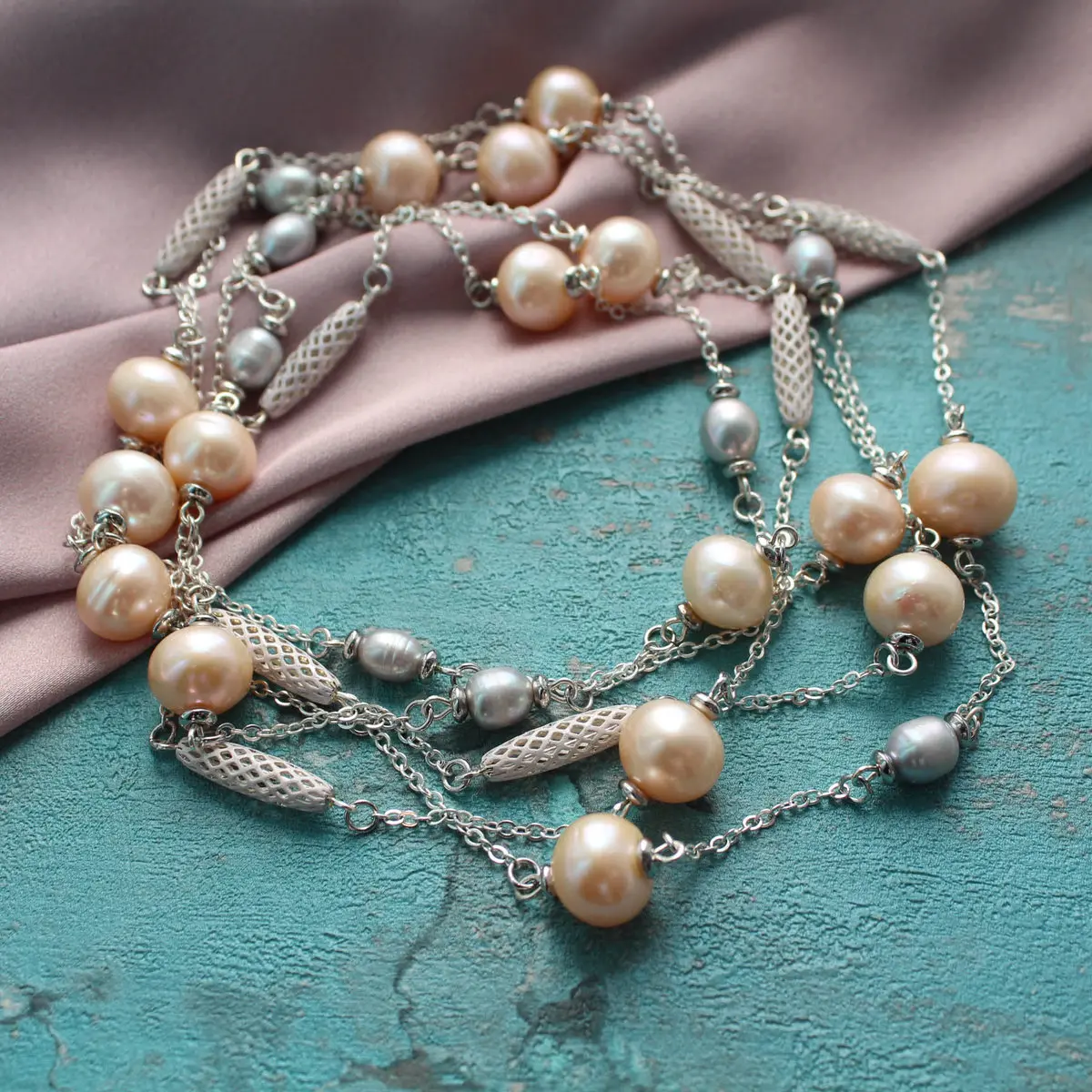 Длинное колье-сотуар из крупного сливочно-розового, серого жемчуга, посеребренной фурнитуры.