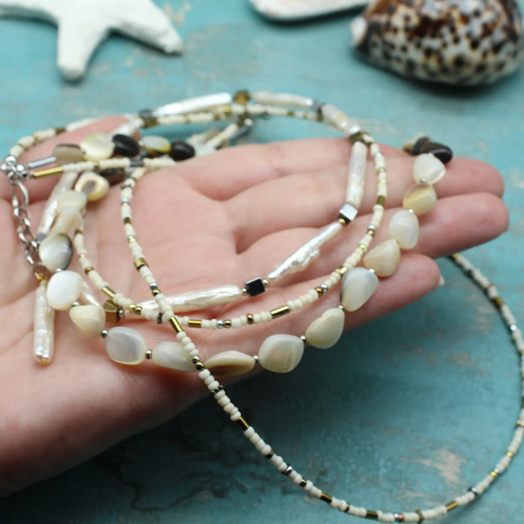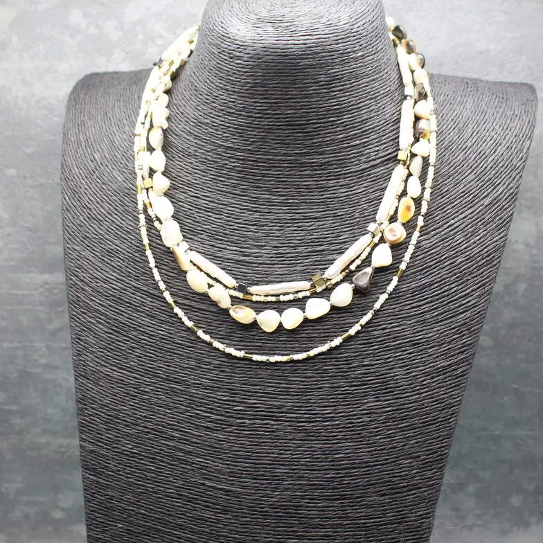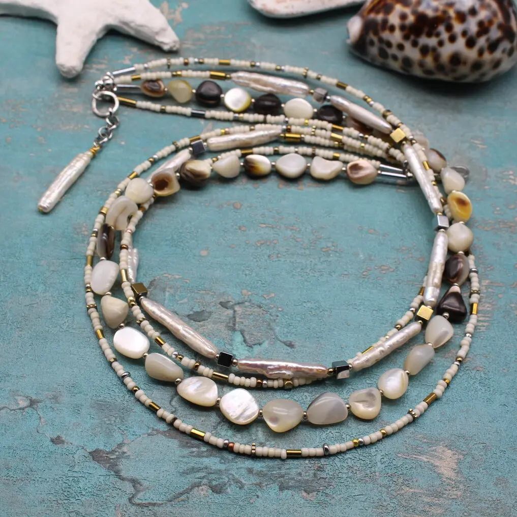 Колье состоит из четырех рядов жемчуга, перламутра, гематита, бисера.
