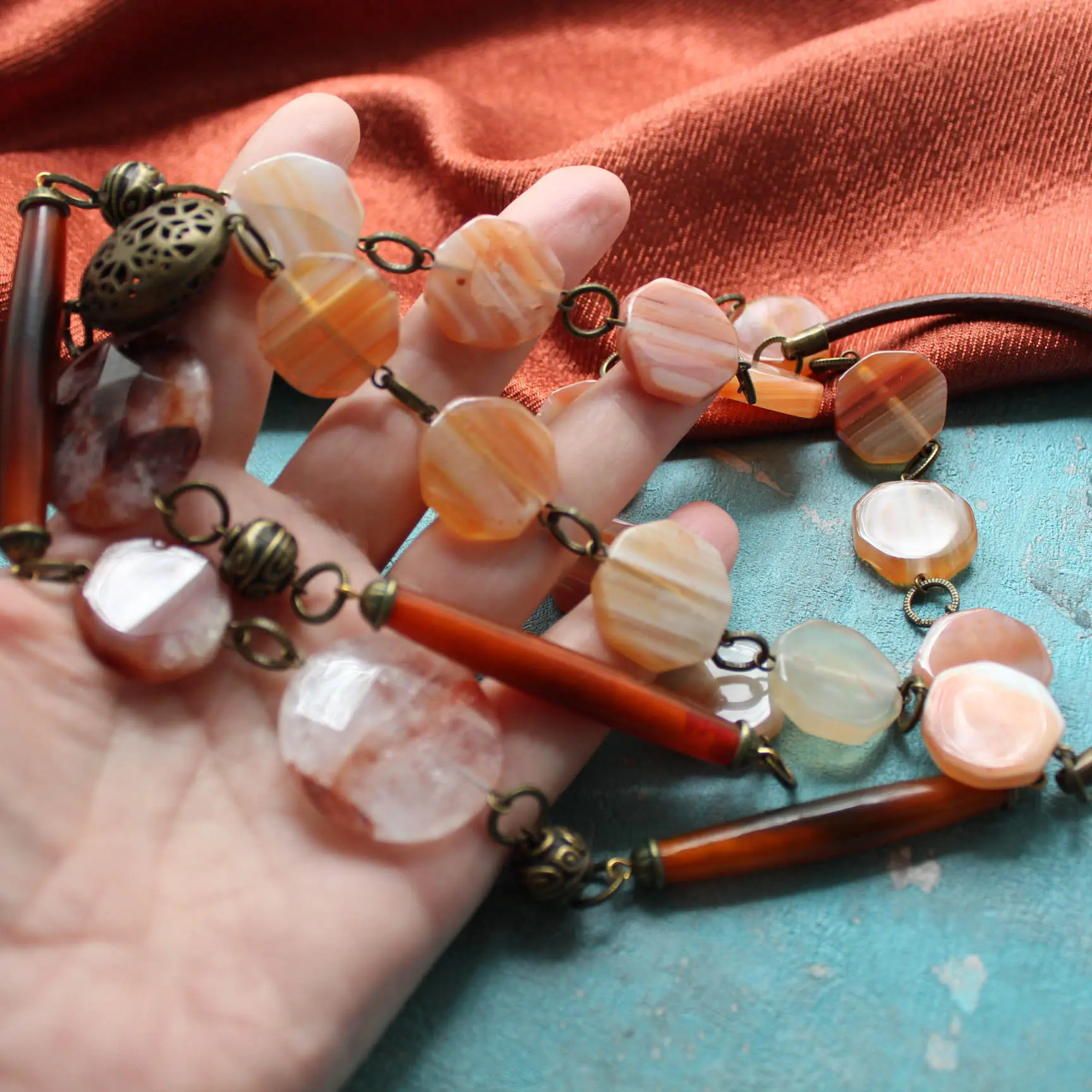 Длинные бусы из сардоникса, рога, фантомного кварца, бронзы, натуральной кожи.