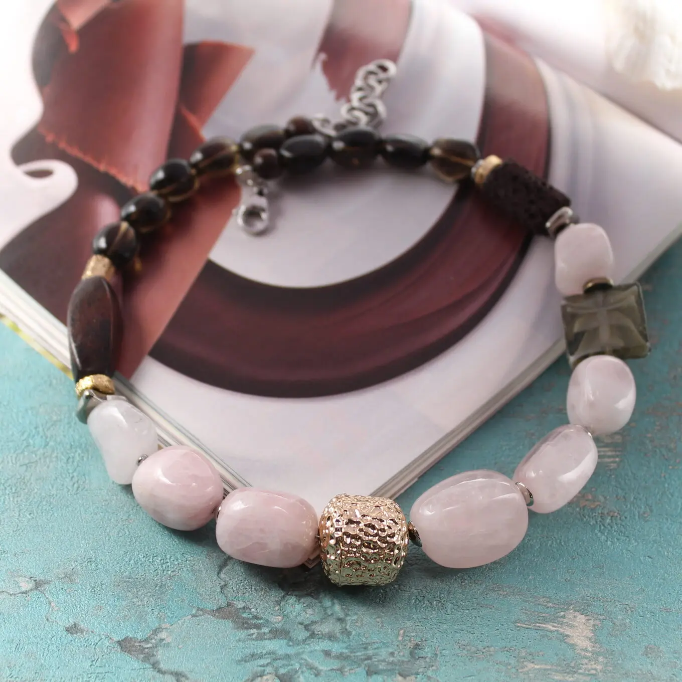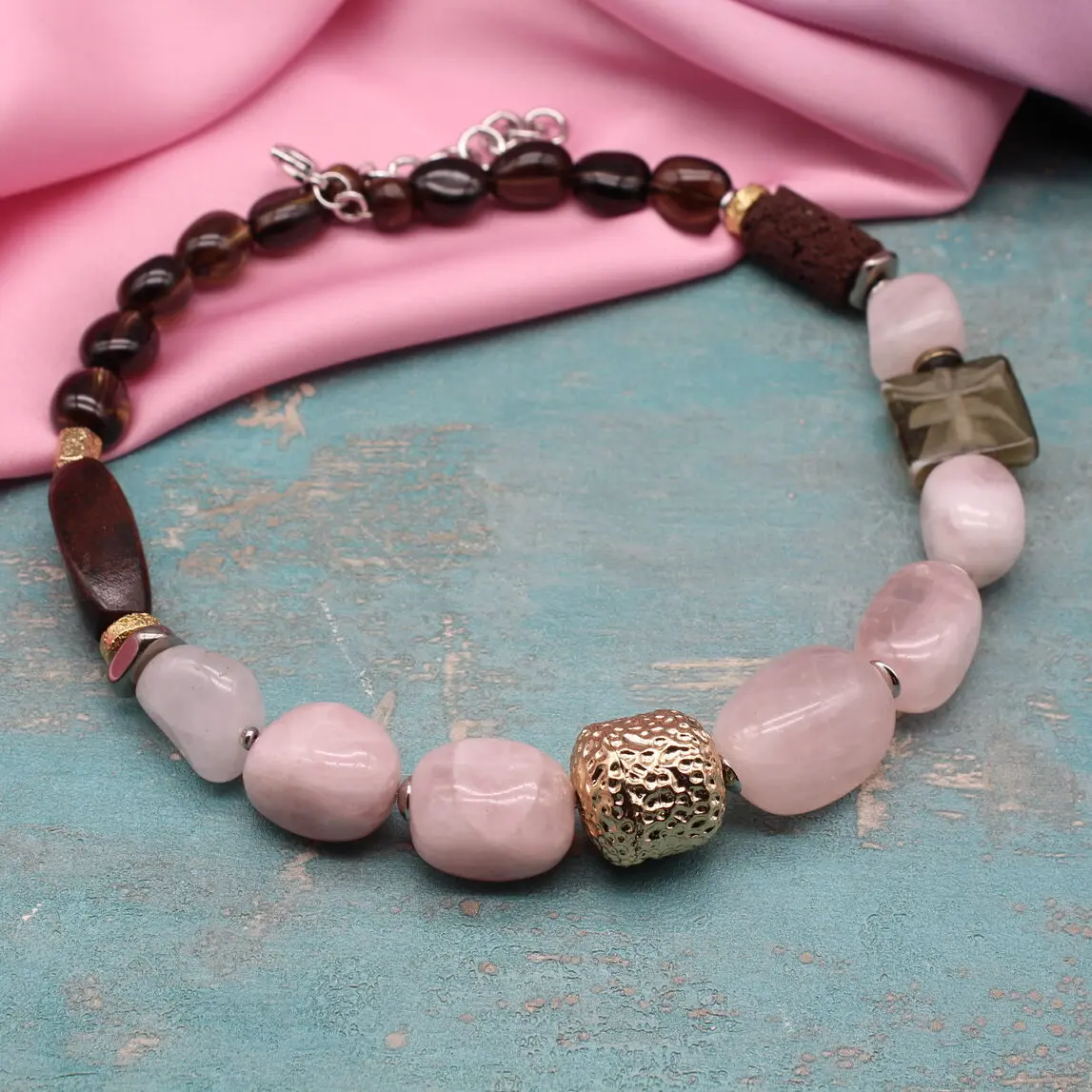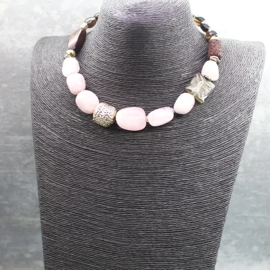 Ожерелье из крупного розового кварца, дымчатого кварца, дерева, лавы, стекла ручной работы, позолоченной фурнитуры с родиевым покрытием.