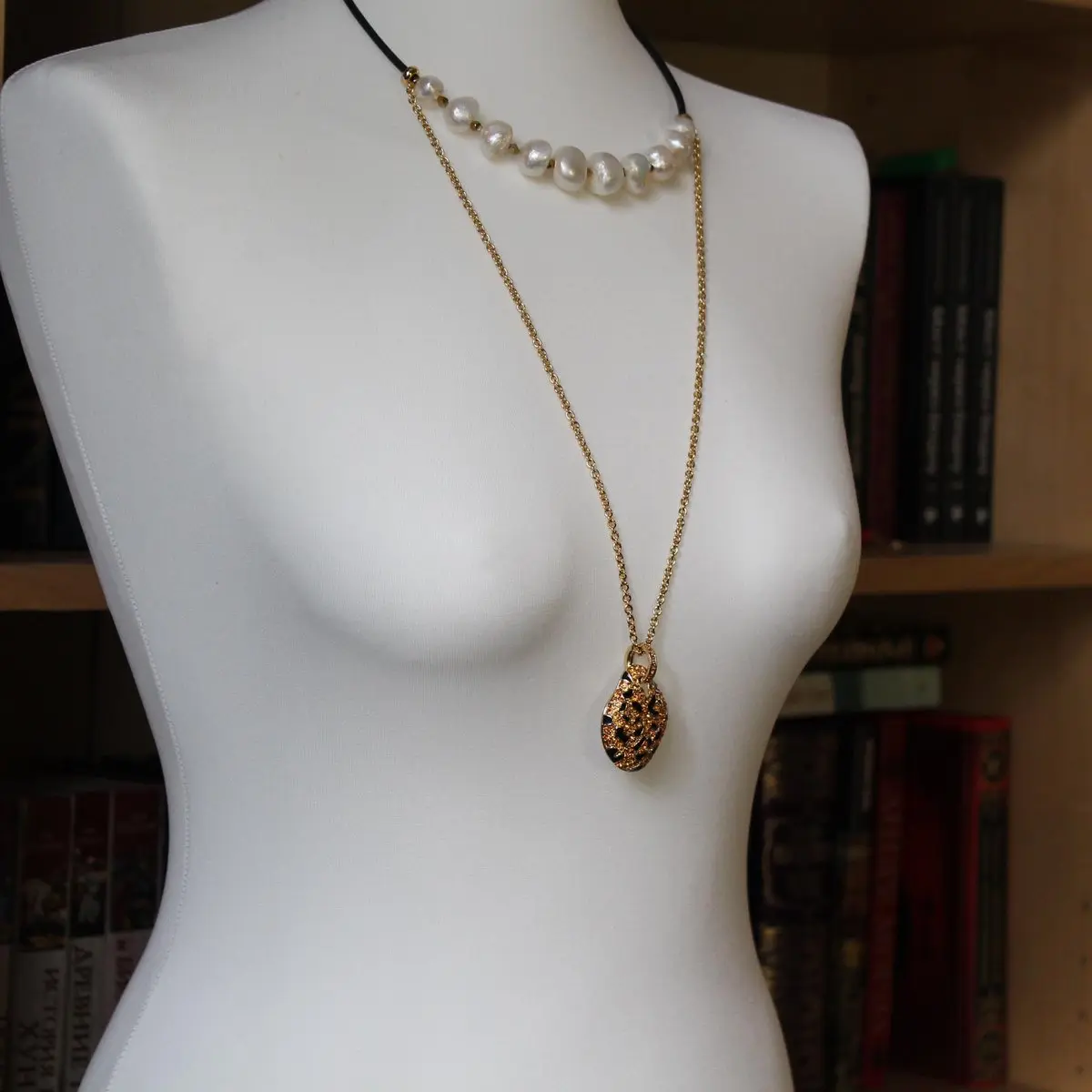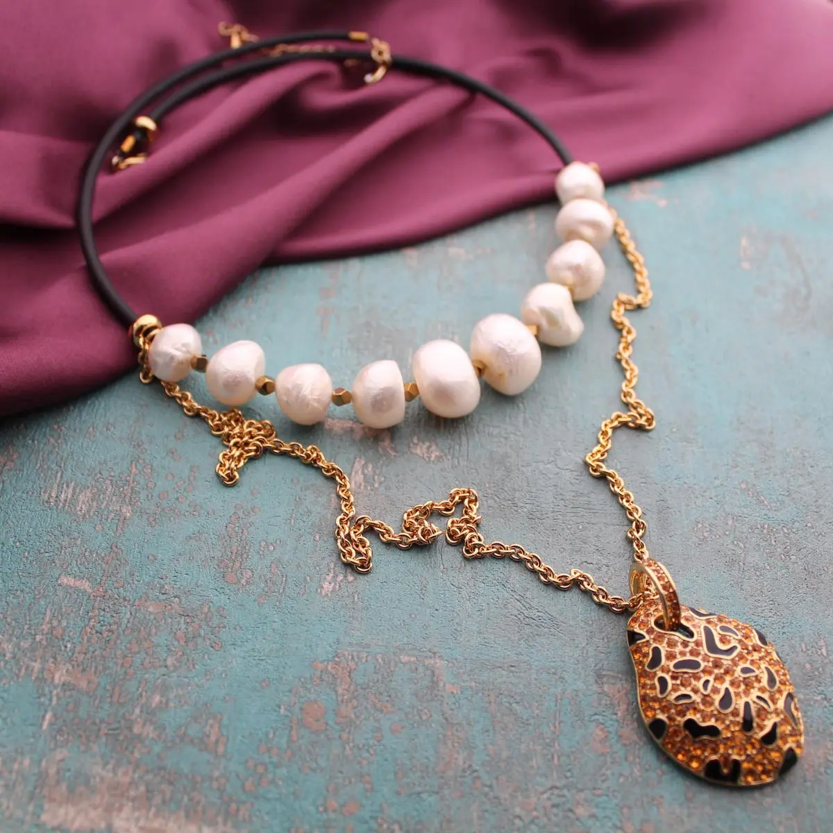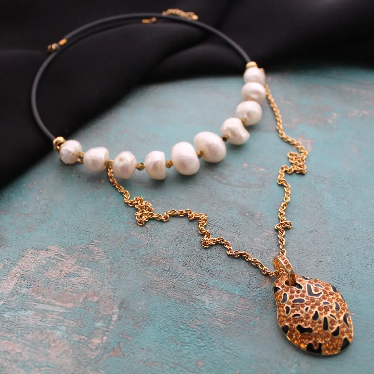 Ожерелье из крупного жемчуга касуми, подвески из эмали, страз, каучука, позолоченной фурнитуры 24К.