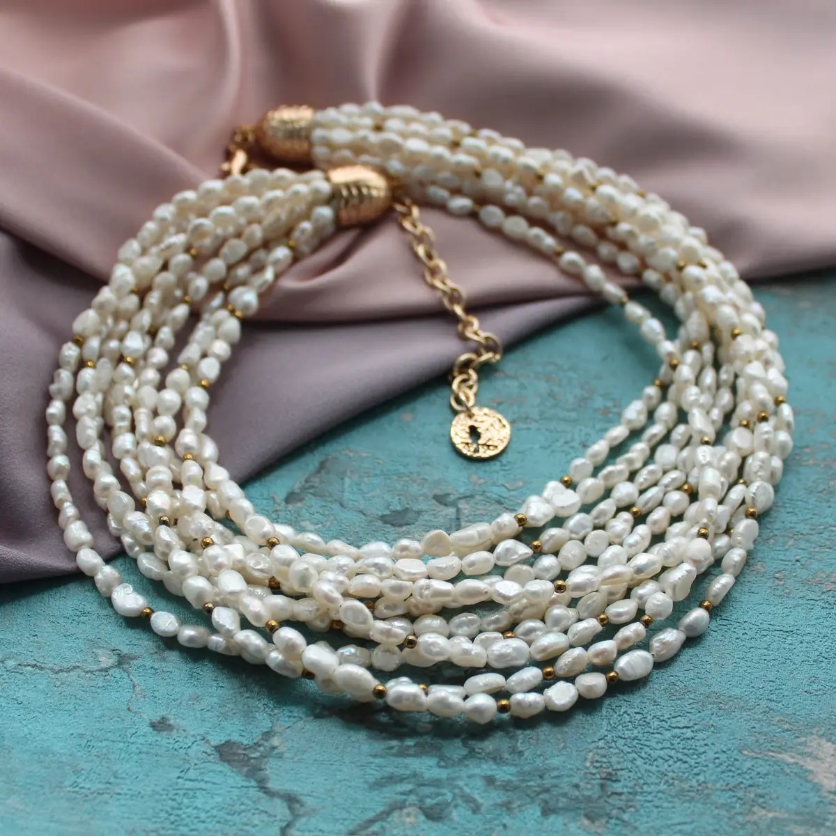 Ожерелье из натурального белоснежного блестящего речного жемчуга барочной формы, позолоченной латуни.