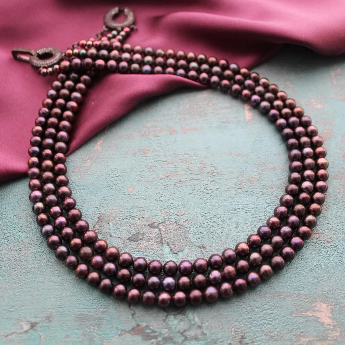 Украшение трехрядное, отлично держит форму, идеально подогнаны жемчужины и длины нитей - смотрится как сплошное полотно!