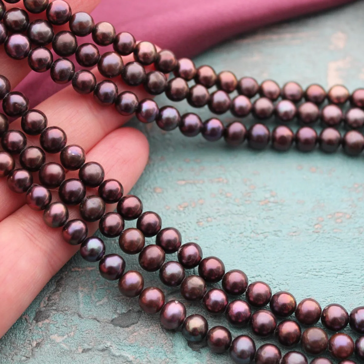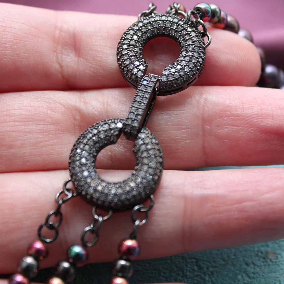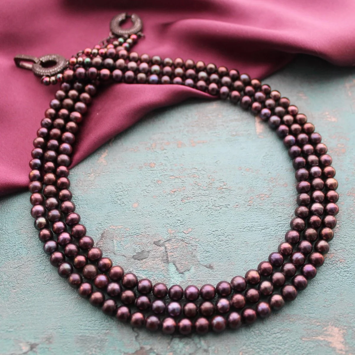 Ожерелье из натуральных жемчужин темно-лилового оттенка с розовыми, золотистыми обертонами, родированной, фурнитуры, инкрустированной микроцирконами.