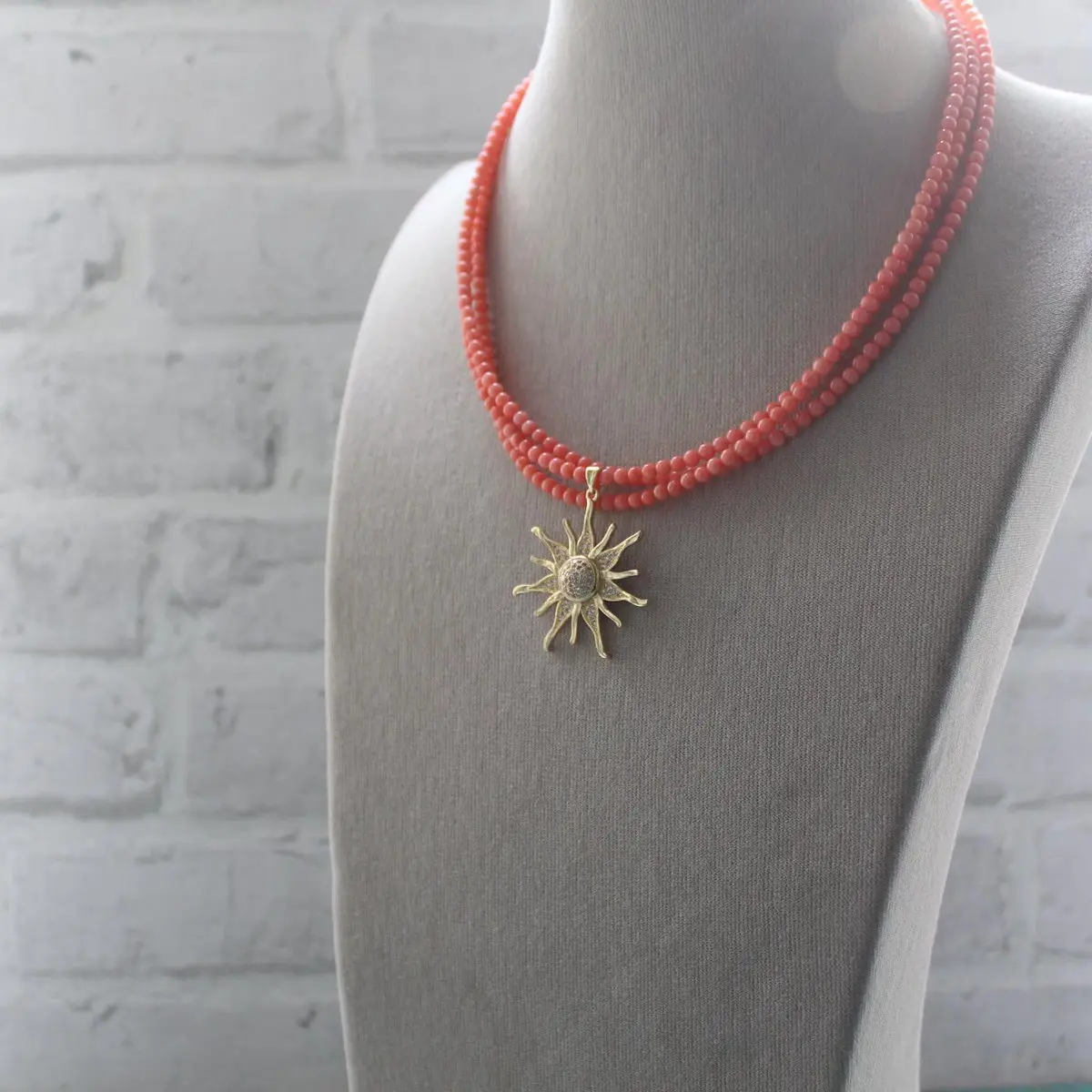 Ожерелье состоит из трех нитей изумительного по цвету и качеству натурального коралла.