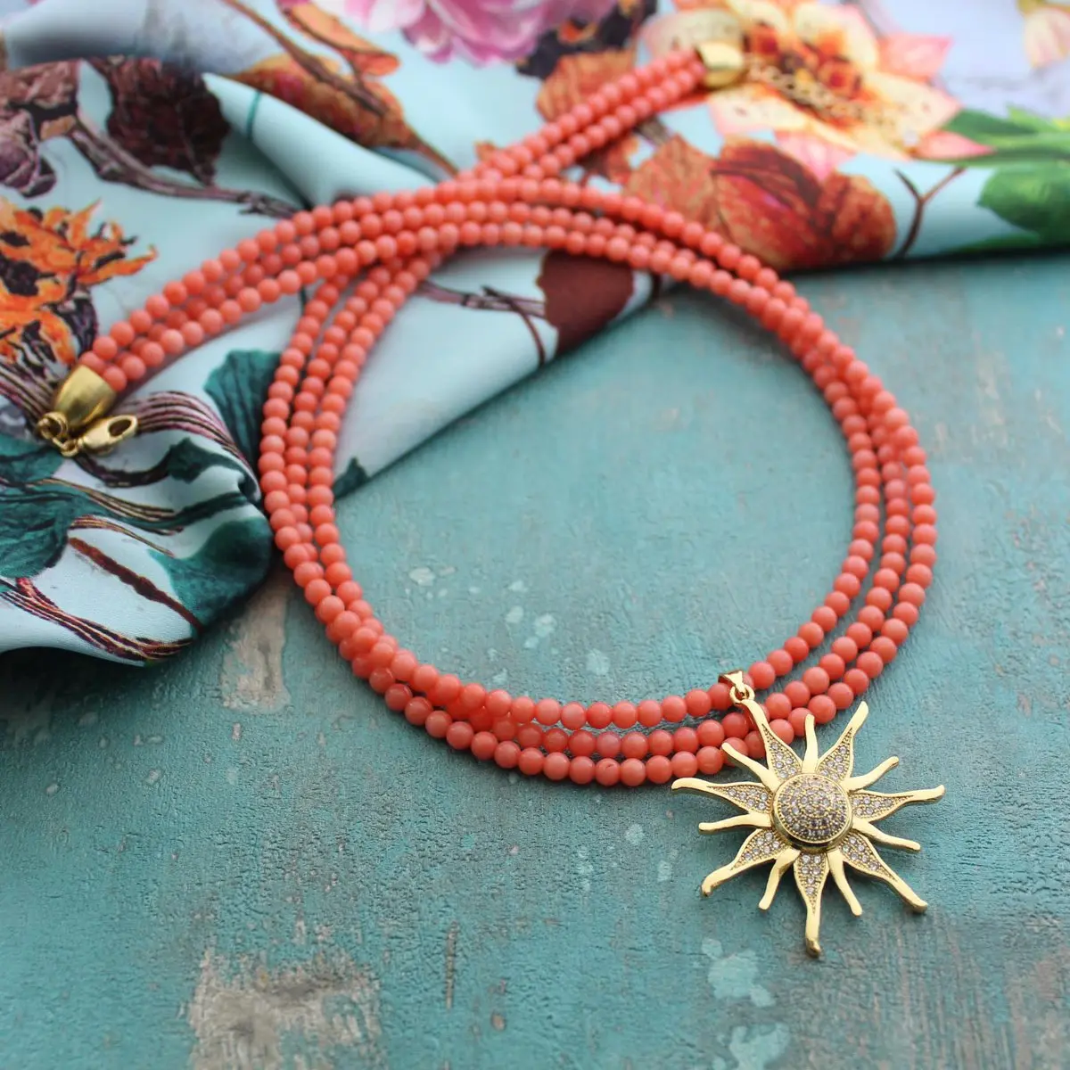 Ожерелье из натурального розового коралла, позолоченной фурнитуры с микроцирконами, латуни.