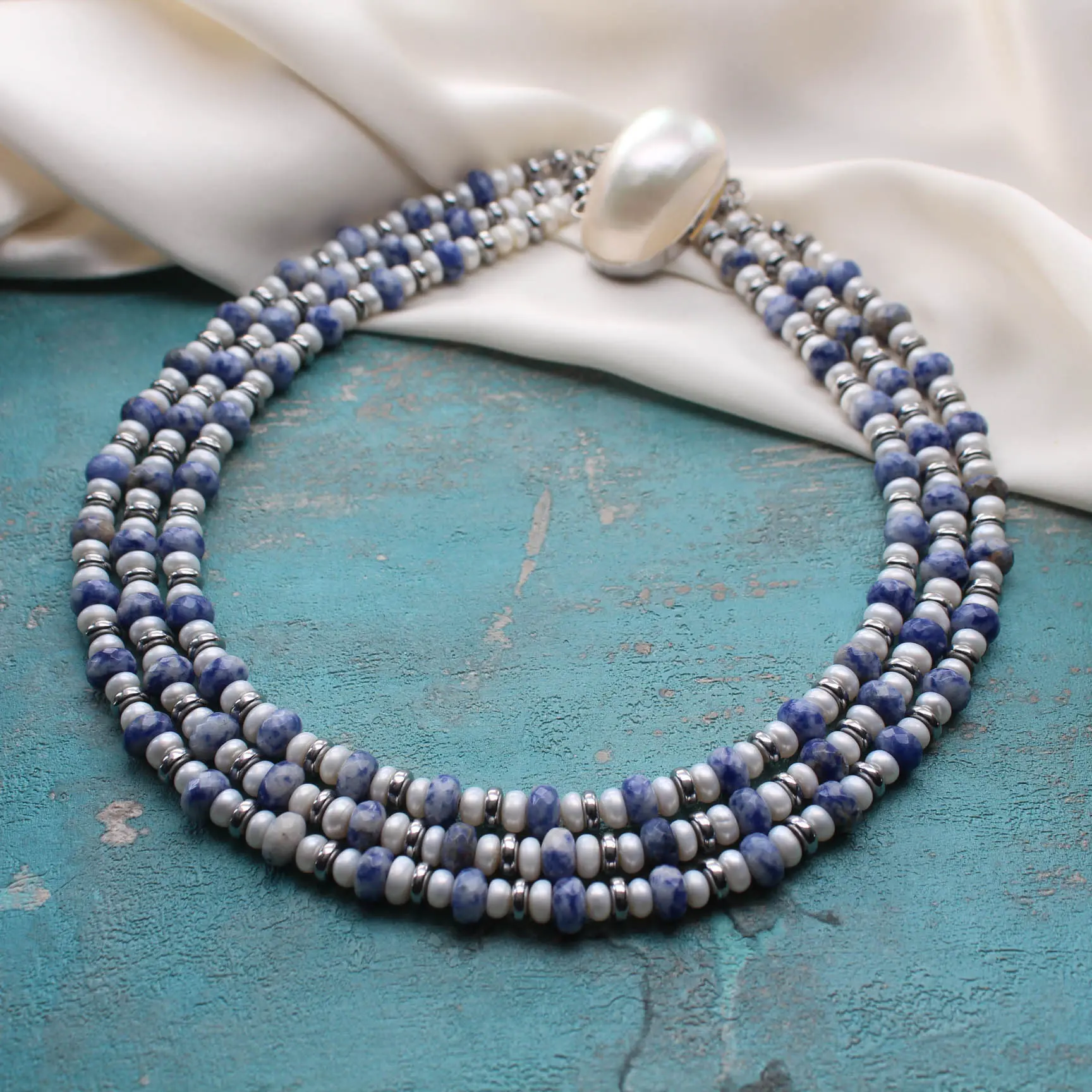 Ожерелье из плоского белого жемчуга, содалита, родированной, фурнитуры с перламутром.