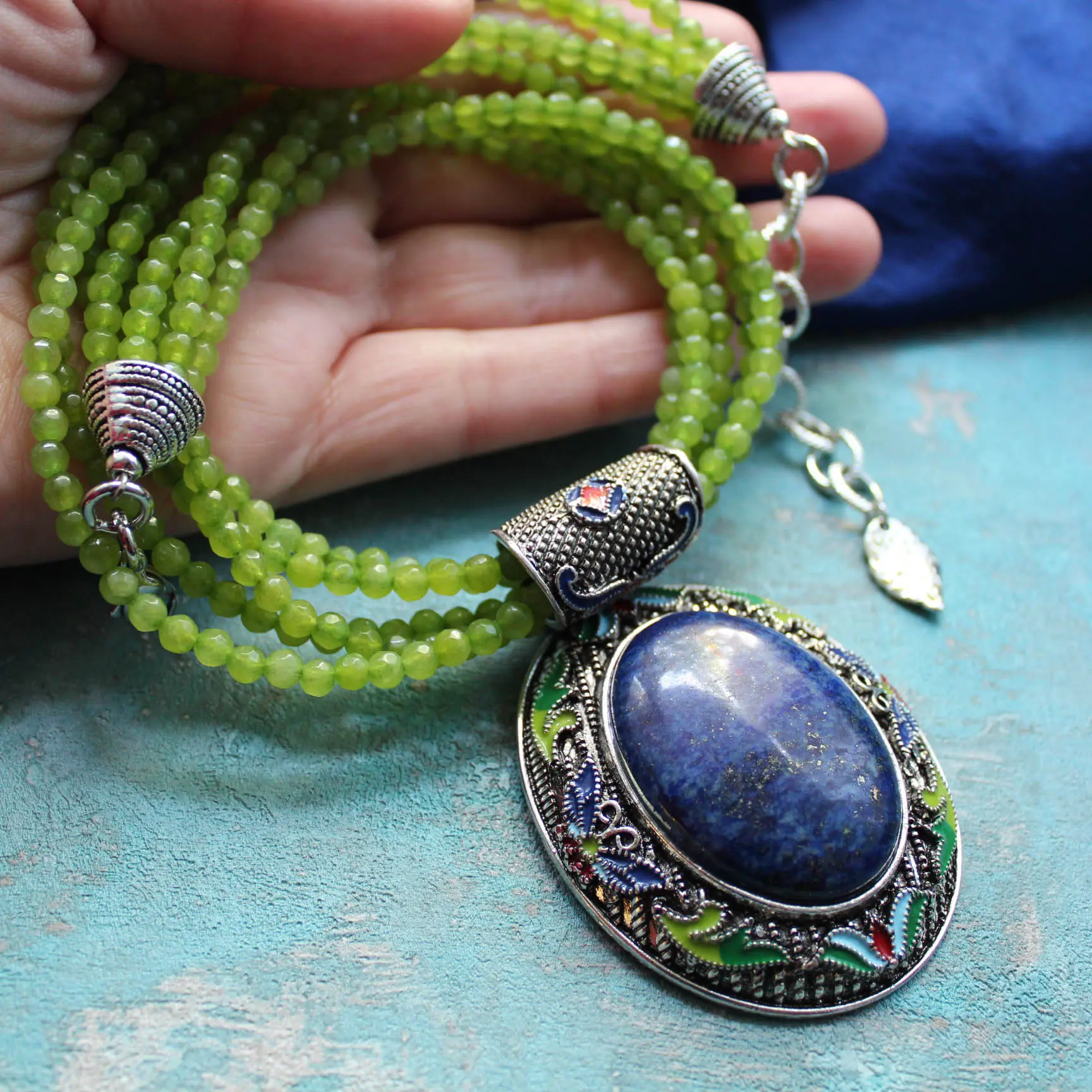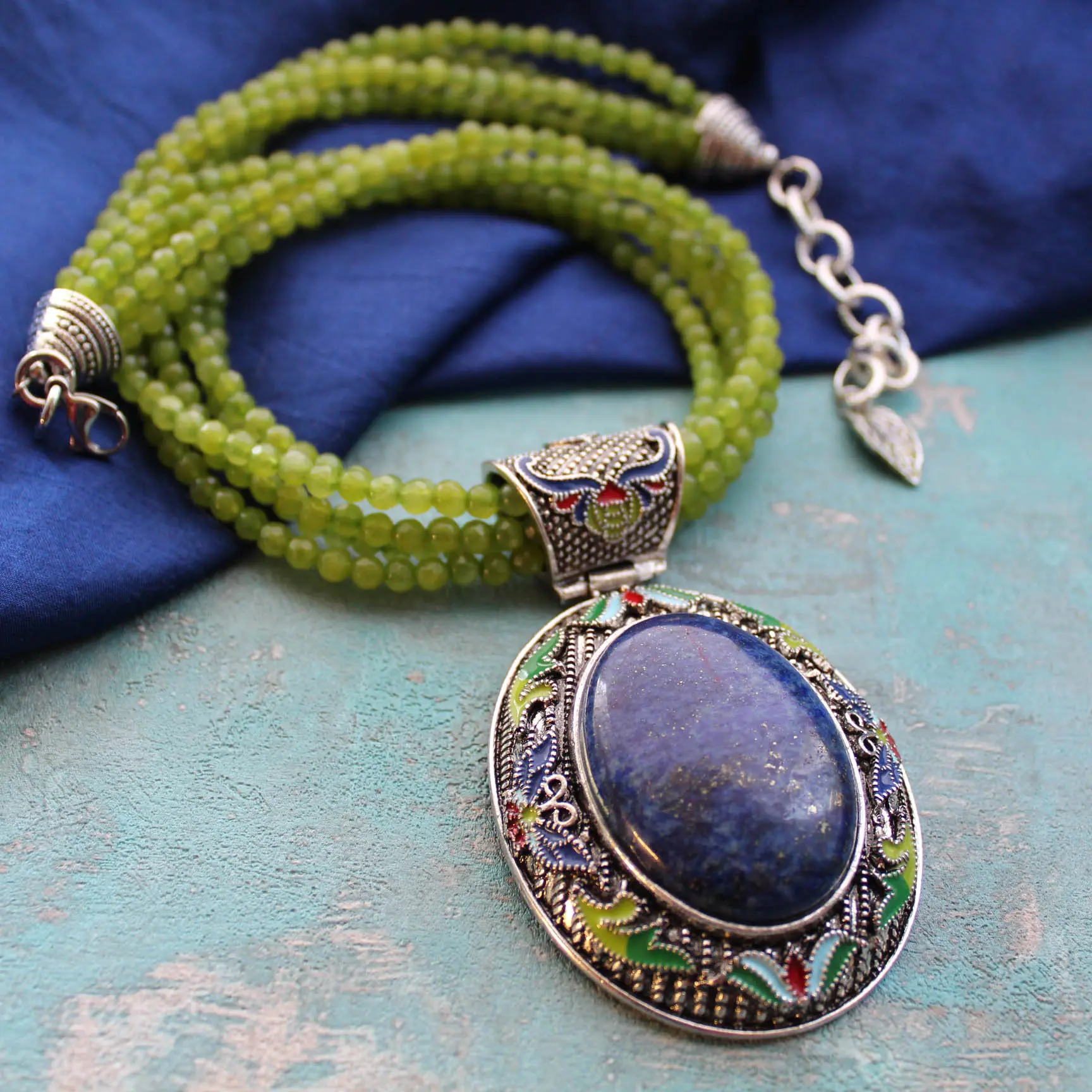 Ожерелье из зеленого халцедона, подвески с натуральным лазуритом и эмалью.