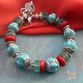 Ожерелье из натурального красного коралла, зеленой тибетской бирюзы, керамики, халцедона, матового стекла, аутентичных бусин и подвески ручной работы с инкрустацией из коралла и бирюзы.