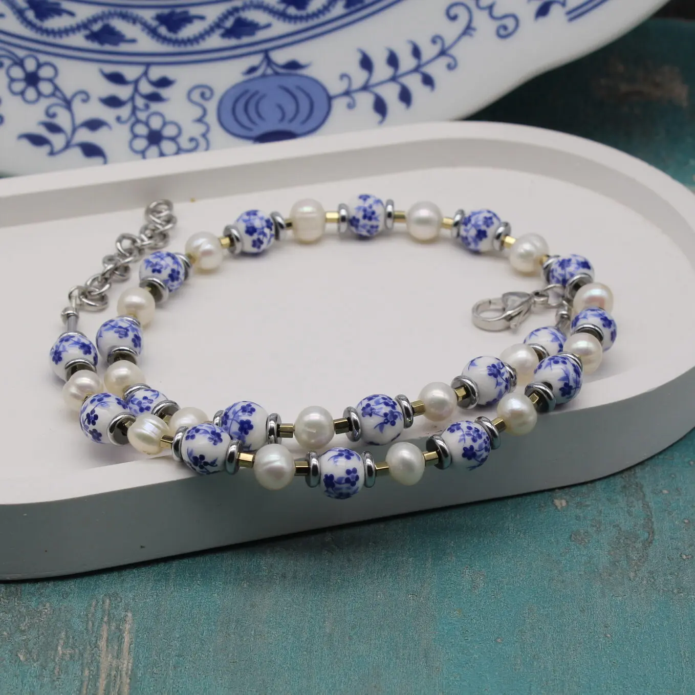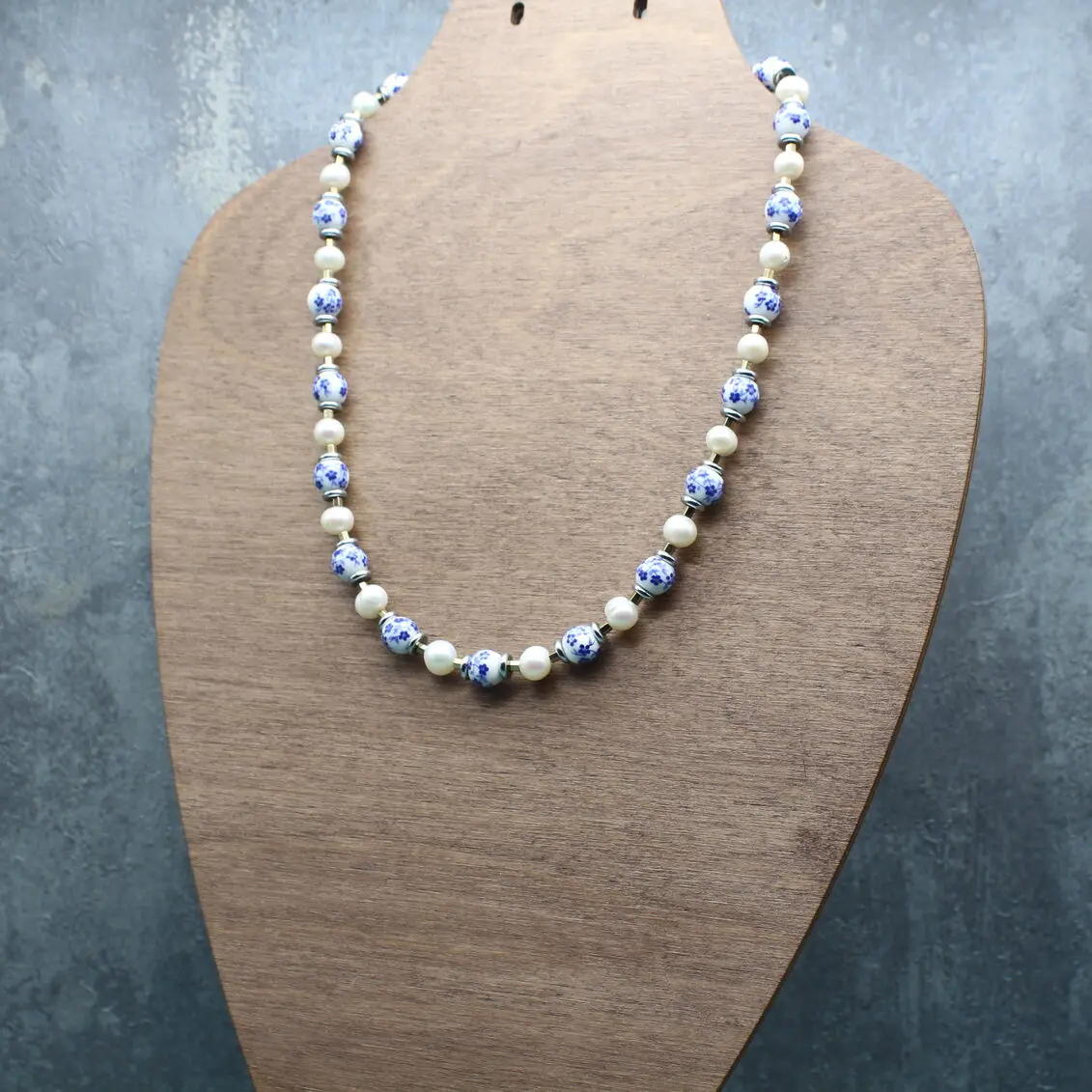 Колье из натурального жемчуга, расписного фарфора, гематита, посеребренной фурнитуры.