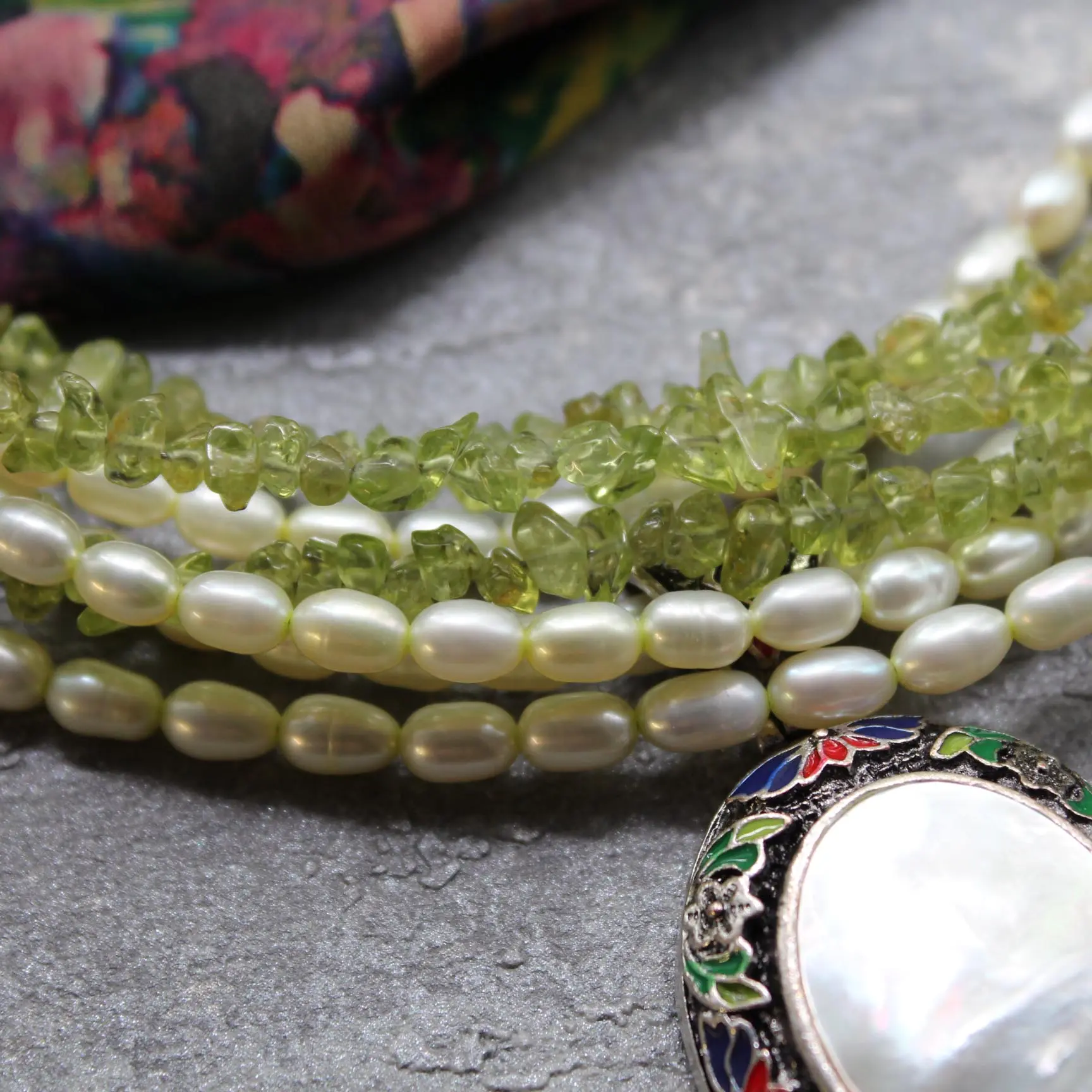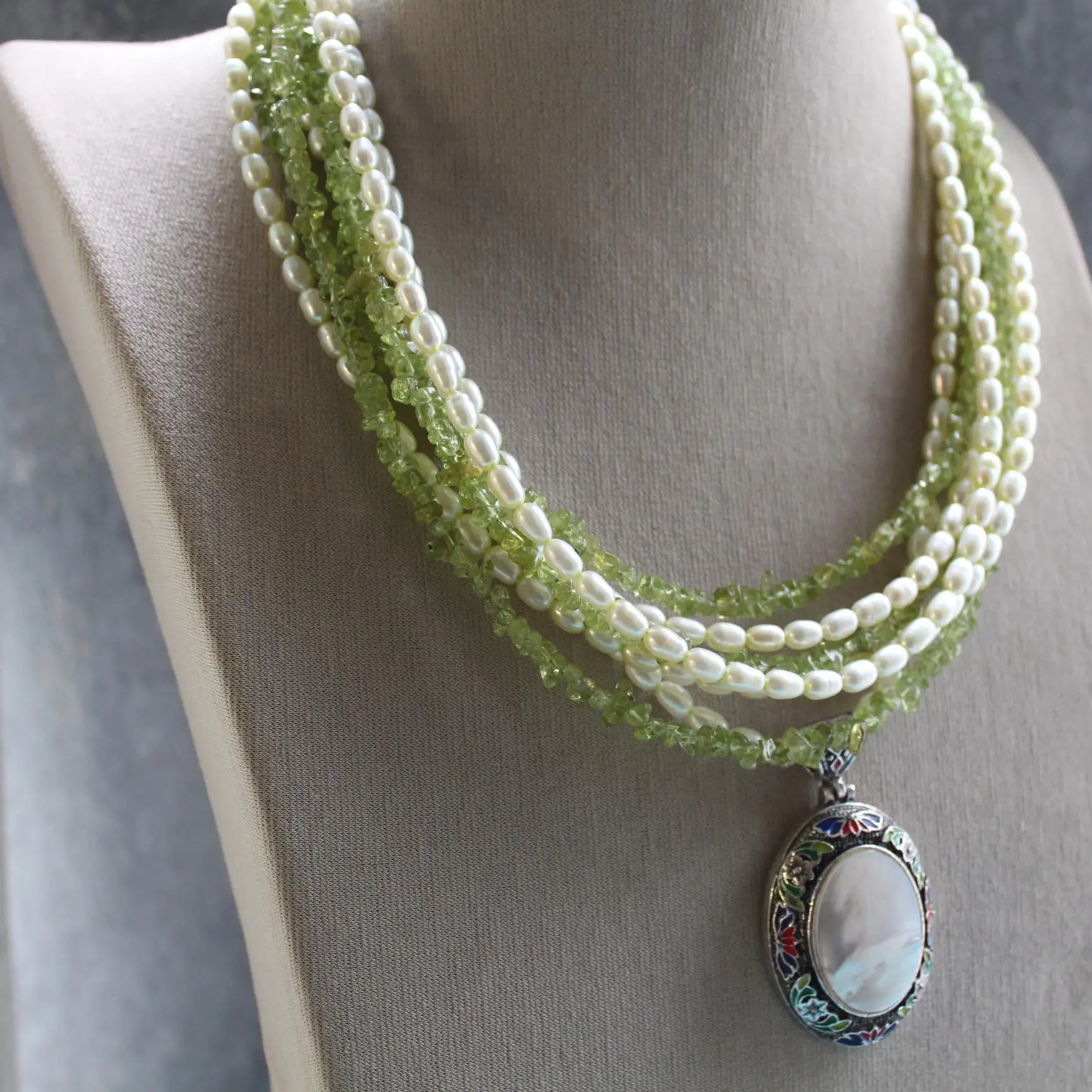Ожерелье из натурального жемчуга, хризолита, подвески с натуральным перламутром и эмалью, посеребренной, родированной фурнитуры.
