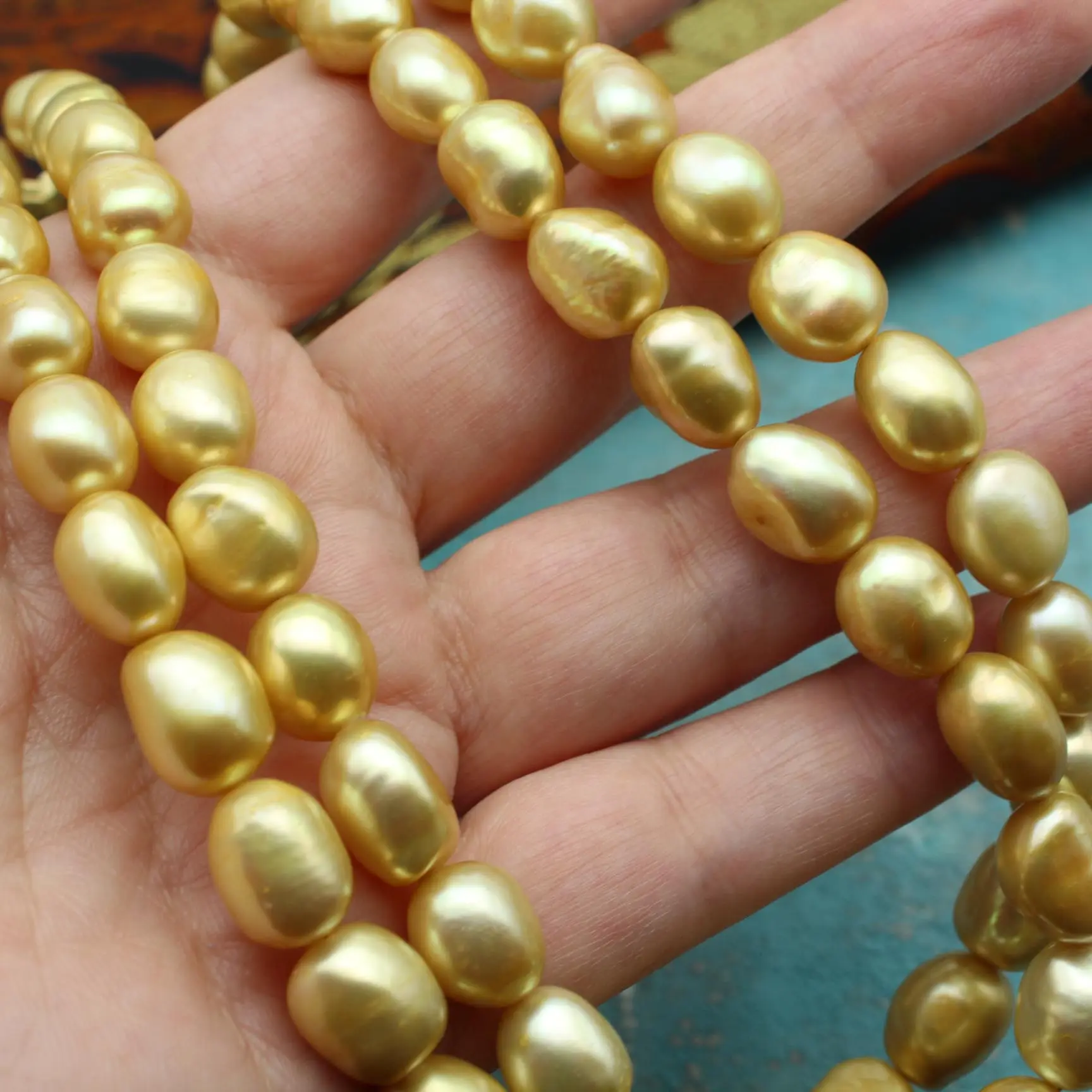 Исключительное качество и потрясающий золотистый оттенок жемчужин смотрится изумительно, словно золотые слитки!