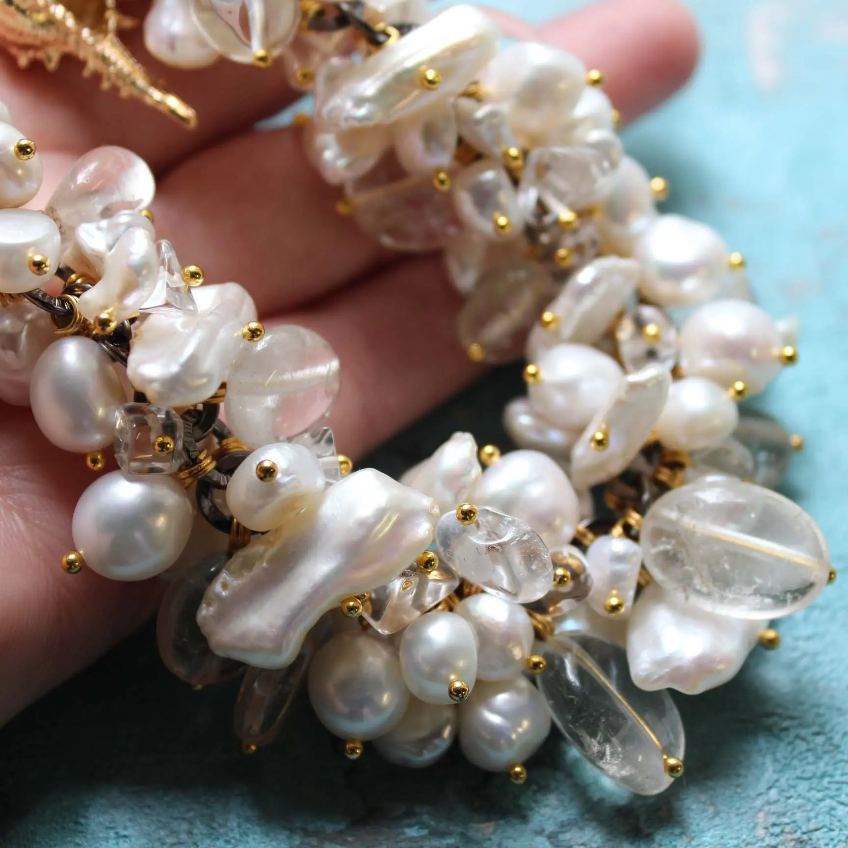 Ожерелье из натурального жемчуга четырех видов - барочного, кейши, круглого, гигантского кейши, горного хрусталя.