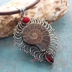 Подвеска из аммонита, красного коралла (прессованного), граната, посеребрение 925.