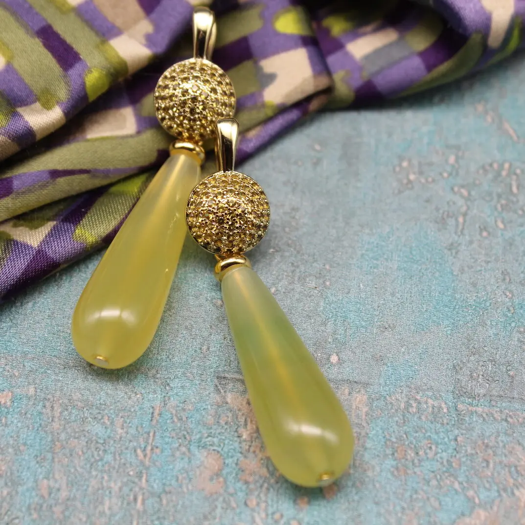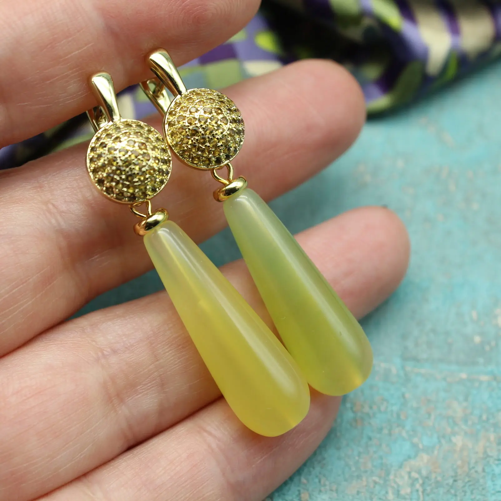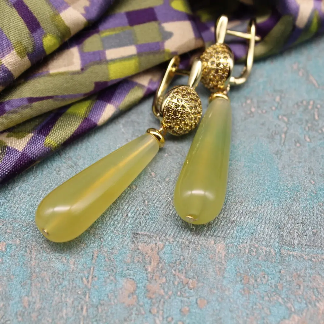 Серьги из натурального халцедона необычного желто-зеленого оттенка, позолоченной фурнитуры 24К, инкрустированной золотистыми микроцирконами.