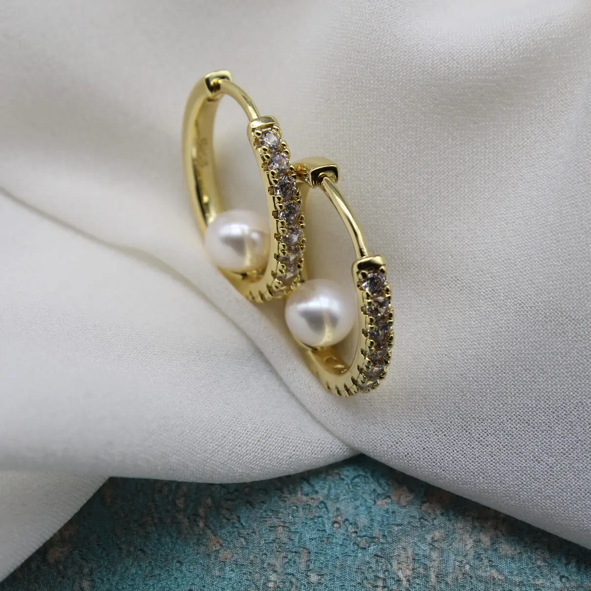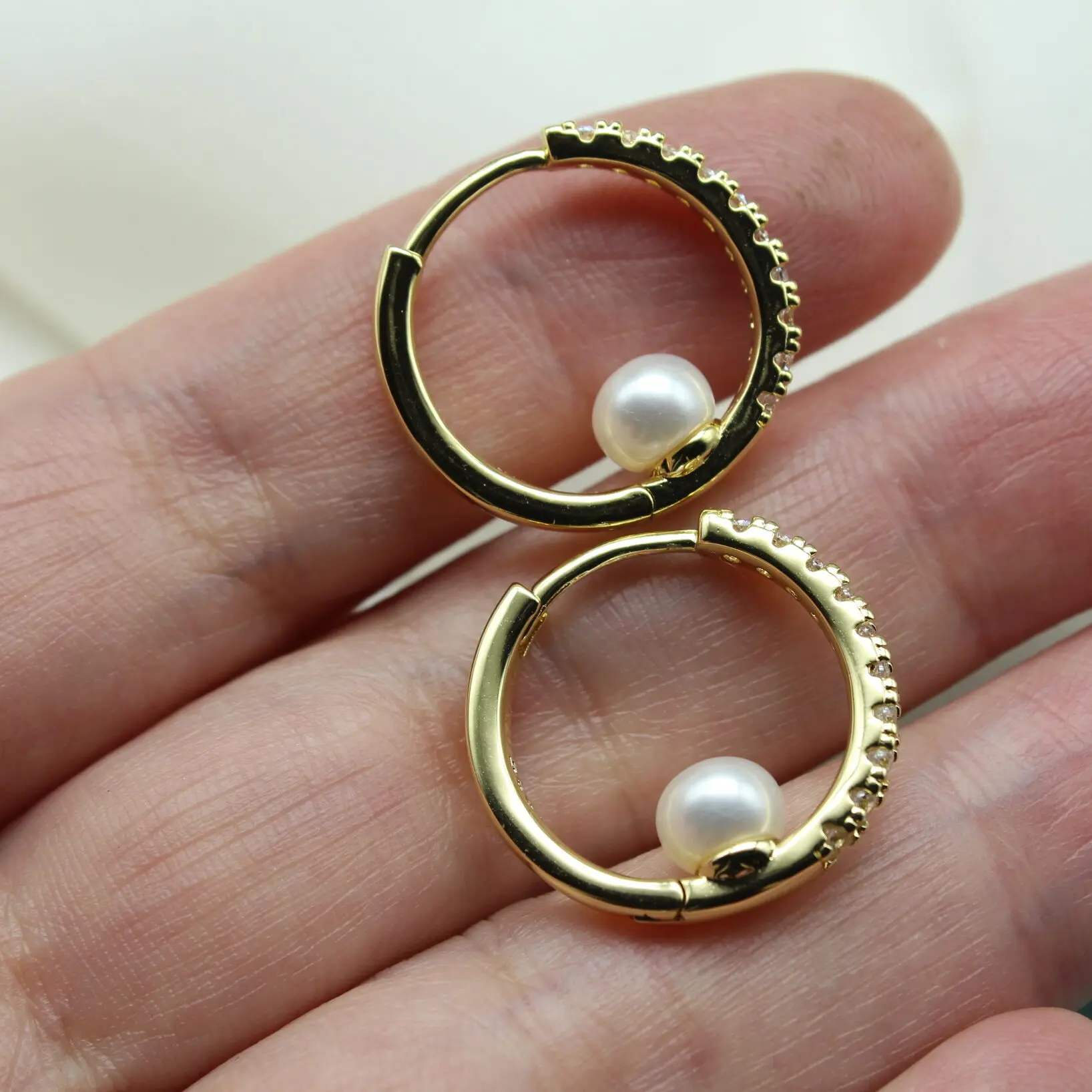 Серьги из натурального жемчуга, серебра с позолотой 24К и родиевым покрытием и прозрачными цирконами.