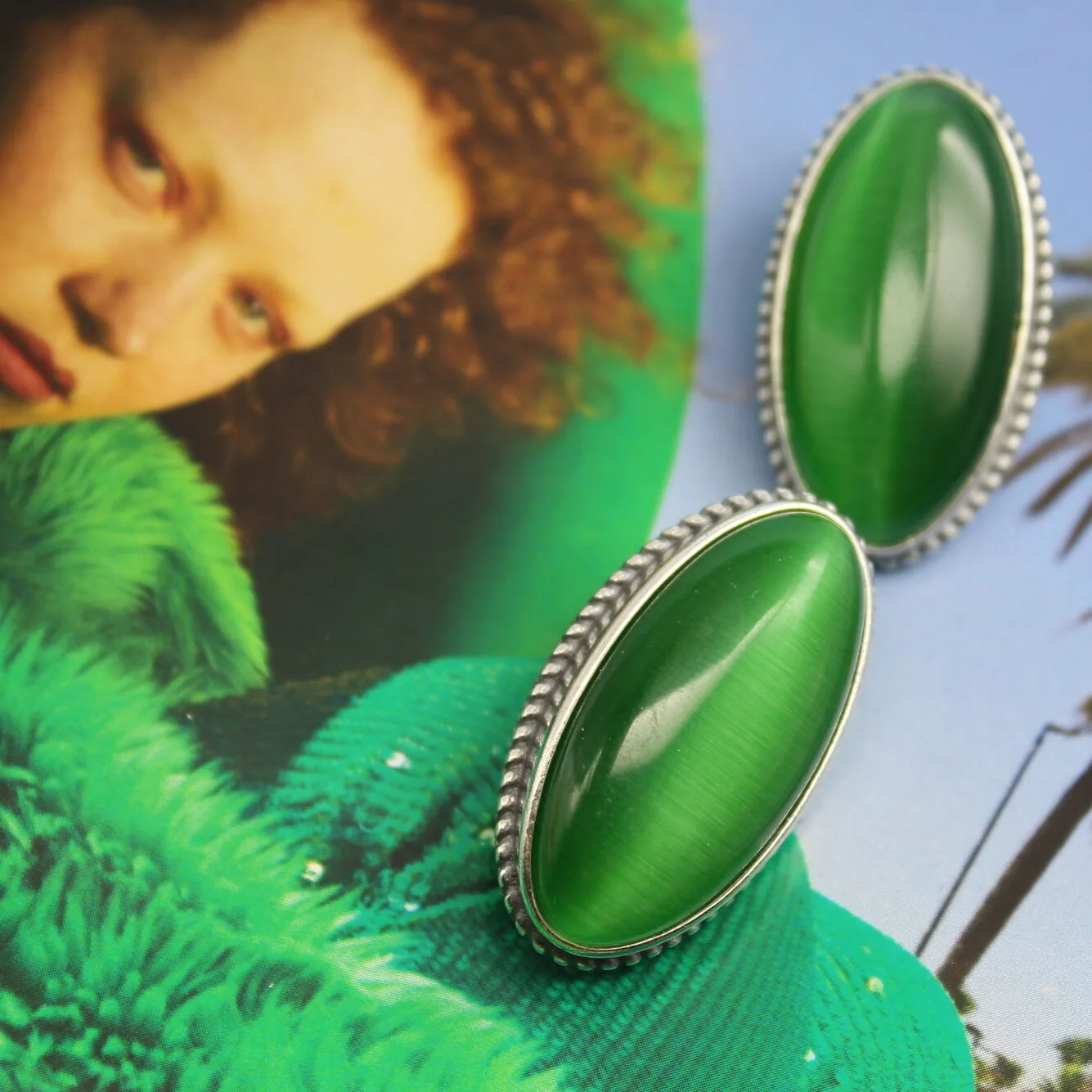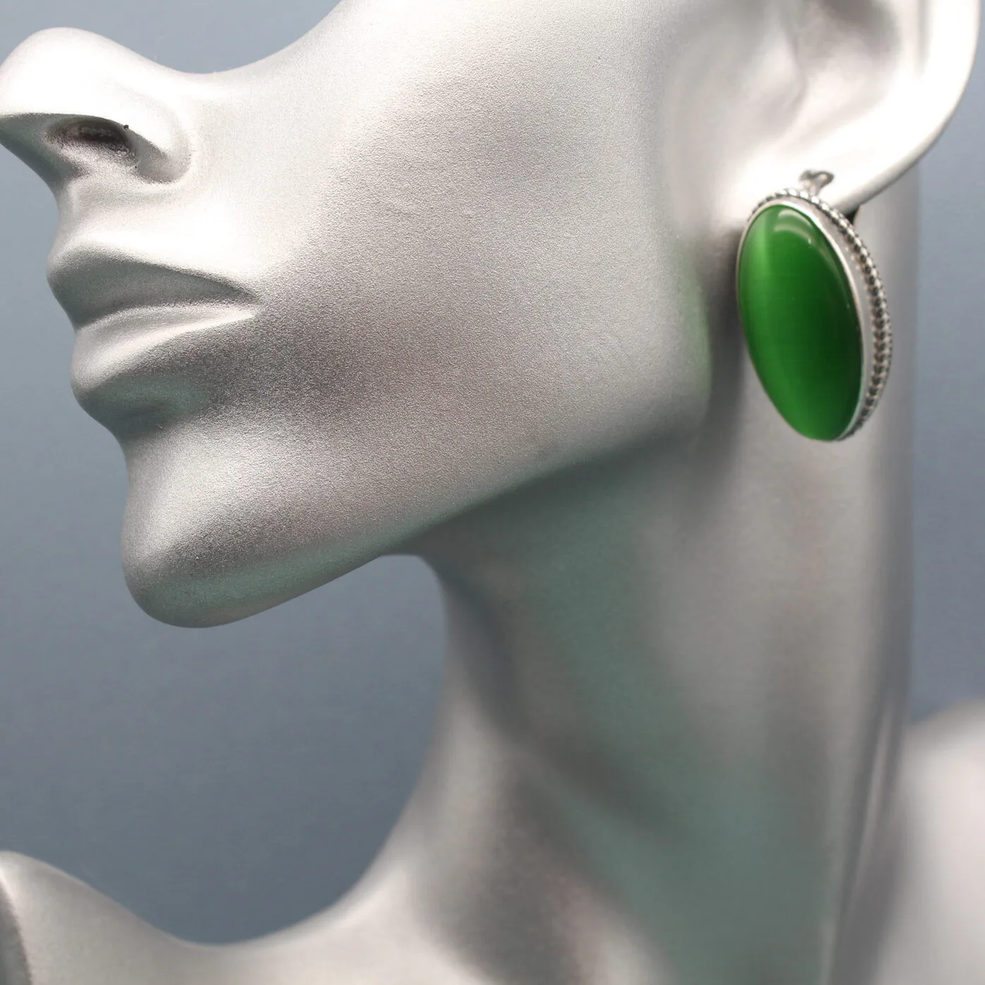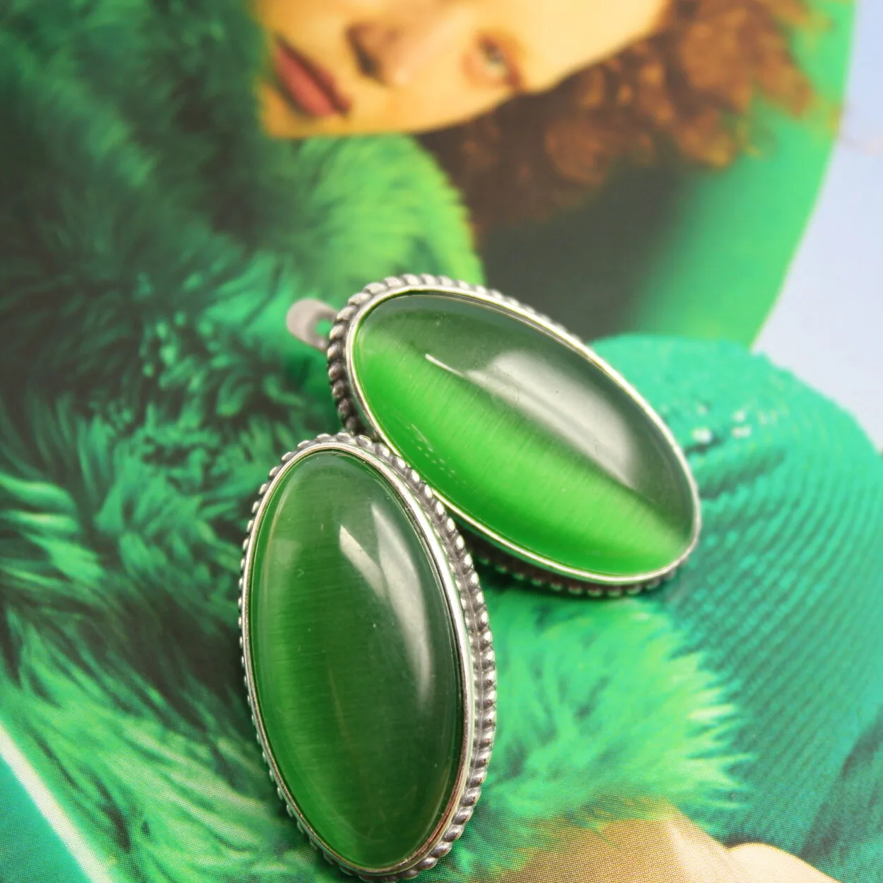 Серьги из зеленого кошачьего глаза, посеребрение 925.