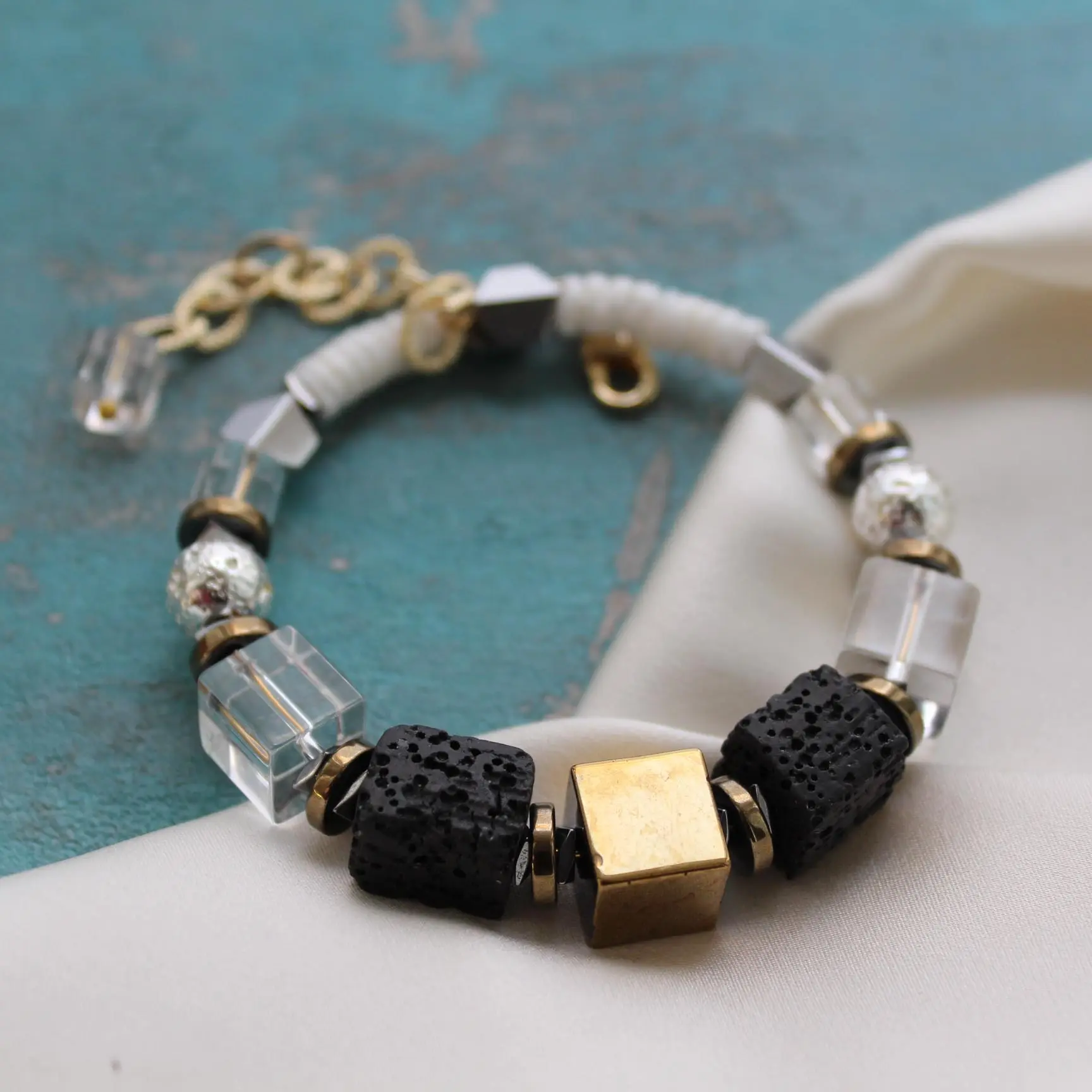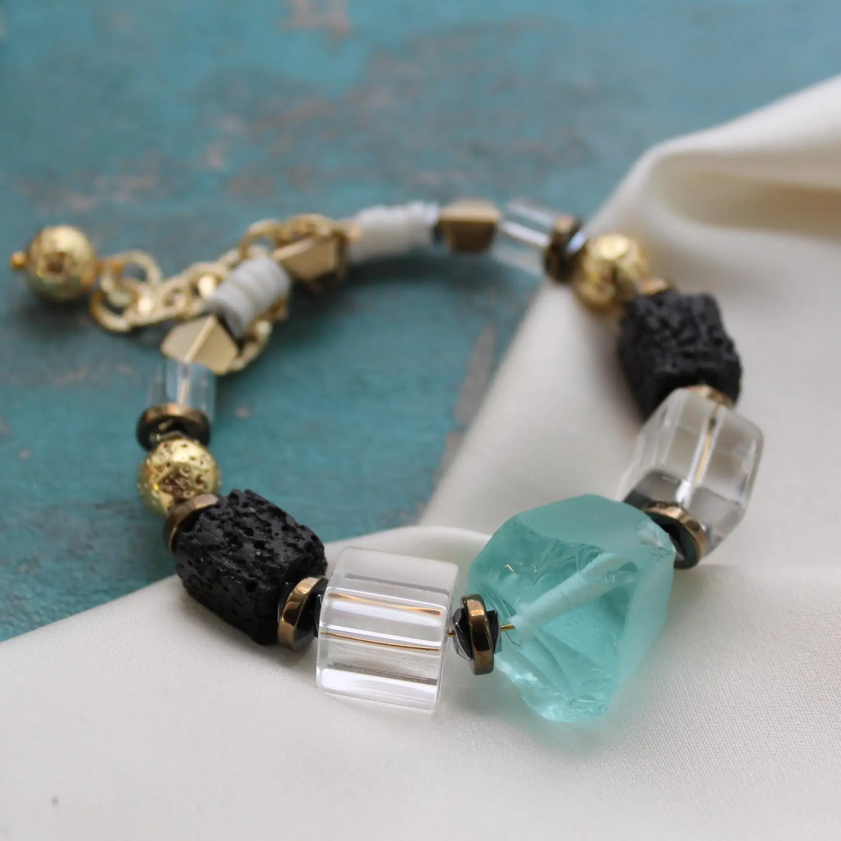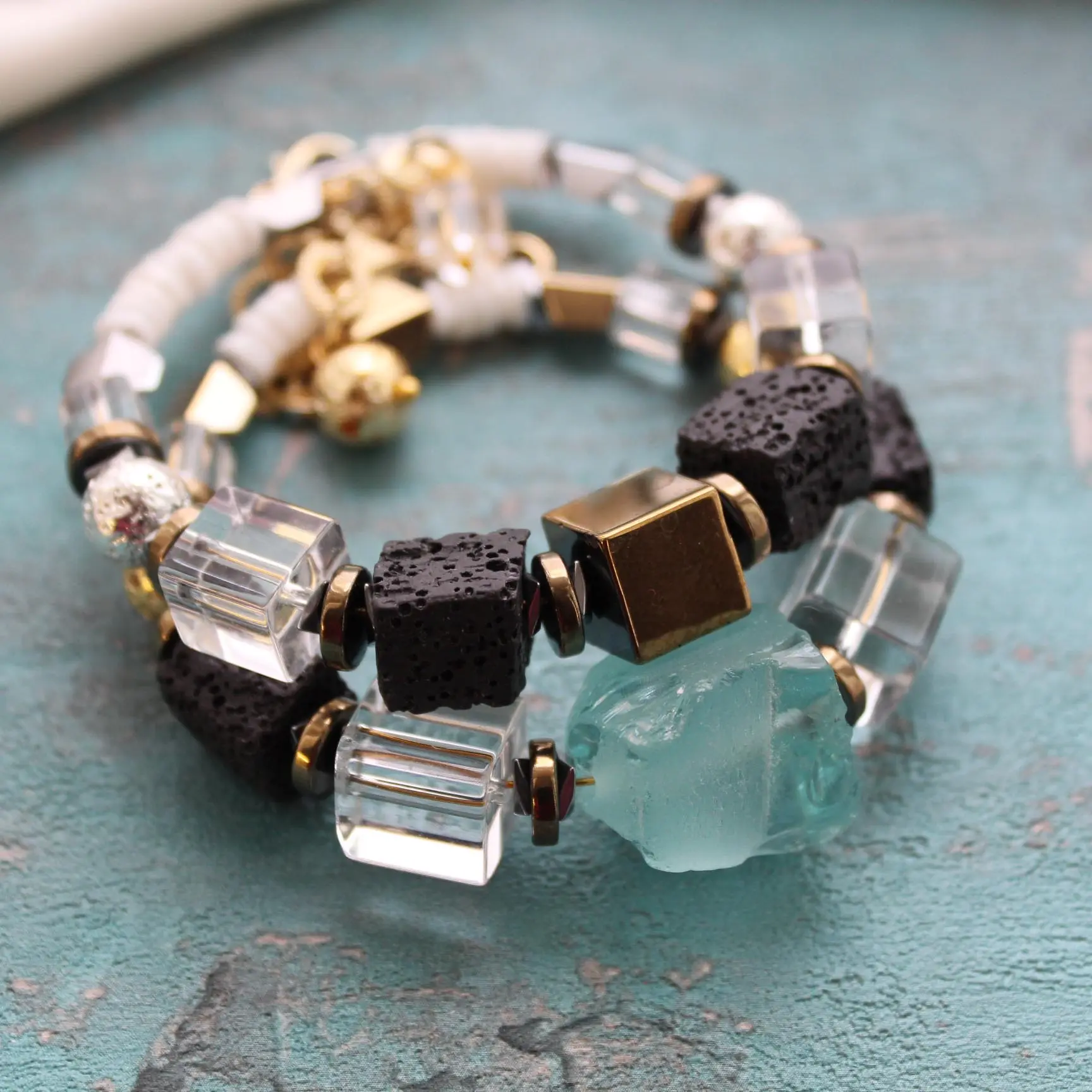 Браслеты из необработанного скола аквакварца, хрусталя, океанической лавы, ракушки.
