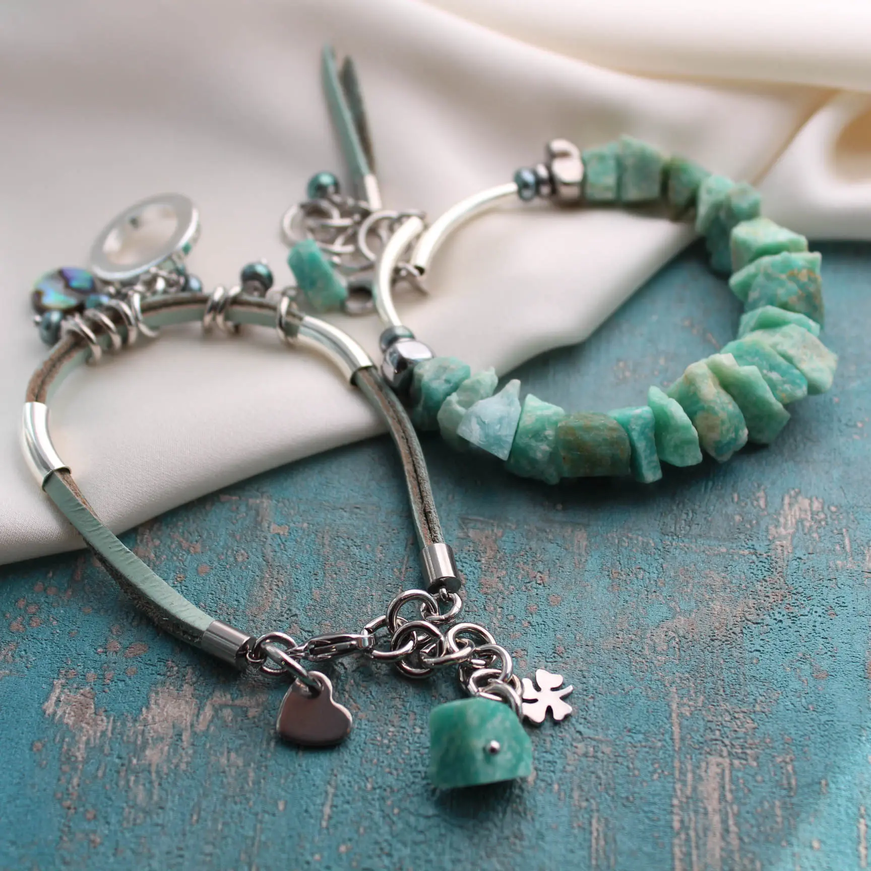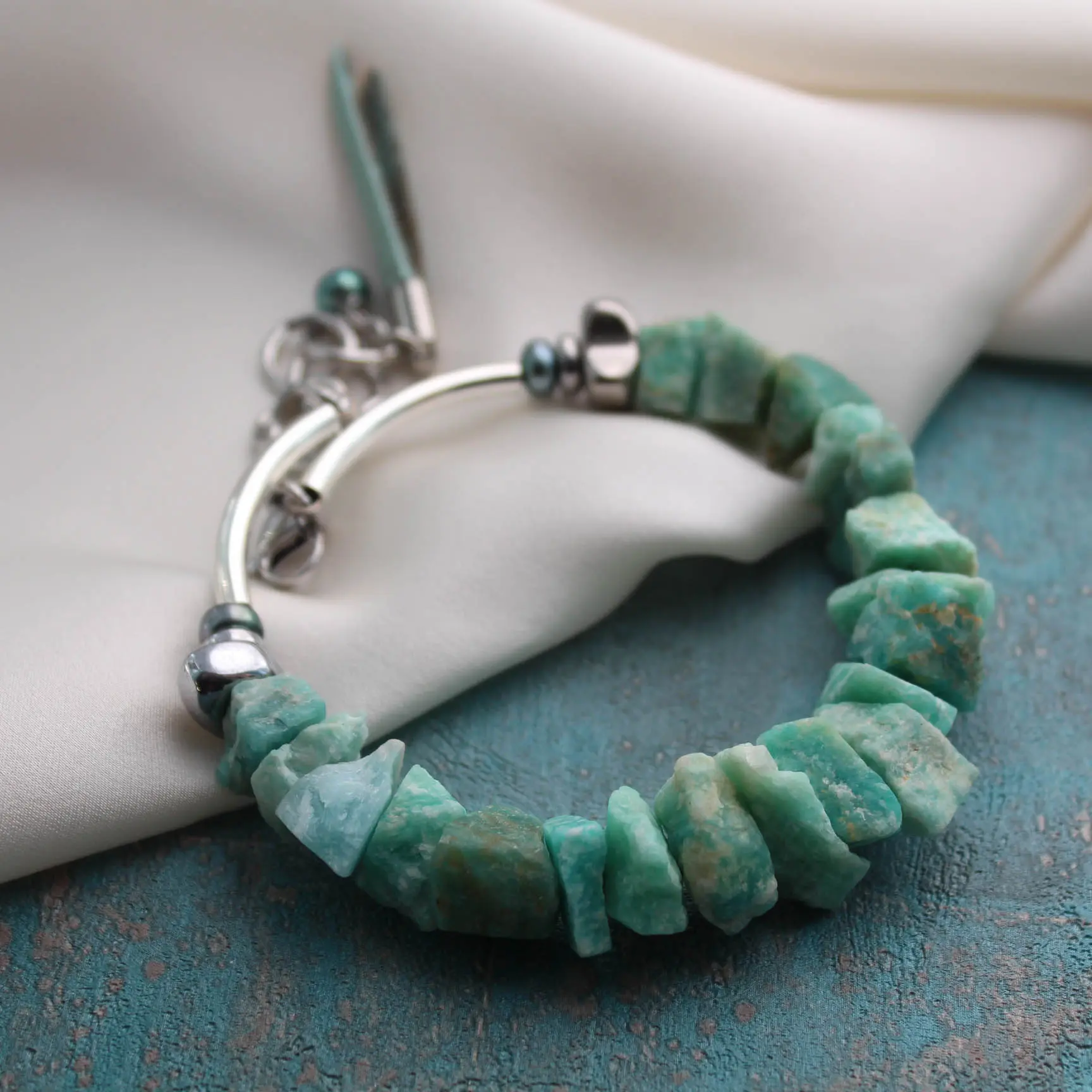 Браслеты из натурального необработанного амазонита, каучука, натурального жемчуга, гелиотиса, натуральной кожи, посеребренных подвесок.