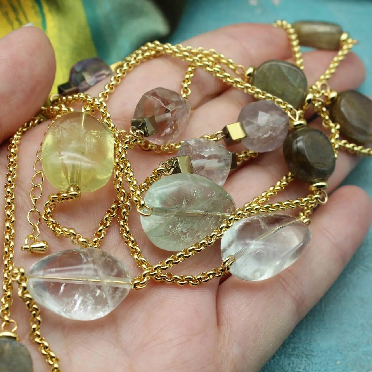 Колье из натуральных крупных бериллов - аквамарина, гелиодора, аметрина, золотого лабрадора, цепочки "роло" с с позолотой 24К.